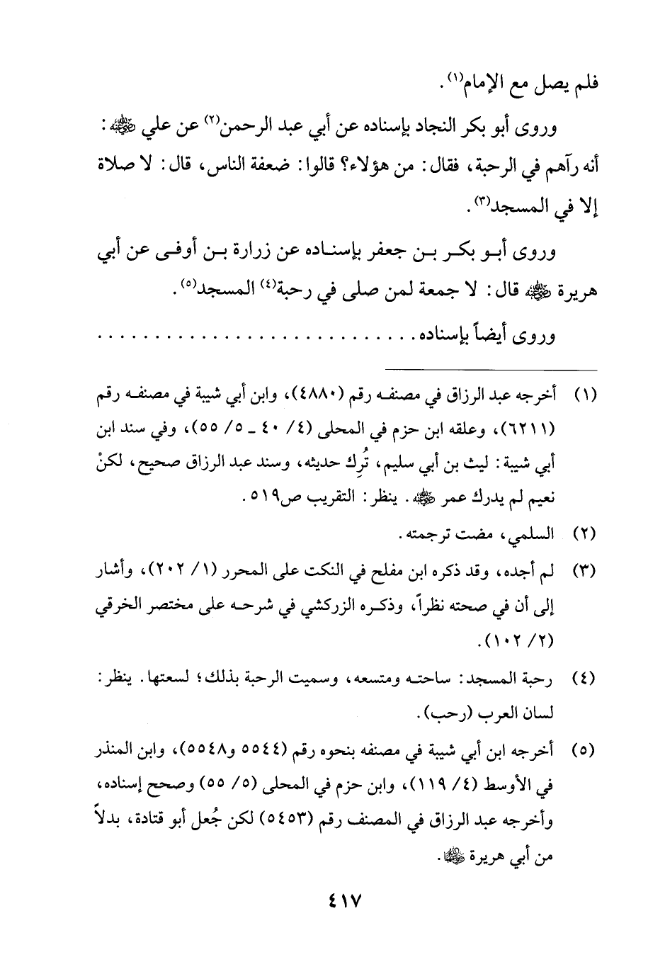 وروى أبو بكر بن جعفر بإسناده عن زرارة بن أوفى عن أبي هريرة - رضي الله عنه - قال: لا جمعة لمن صلى في رحبة (¬4) المسجد (¬5).