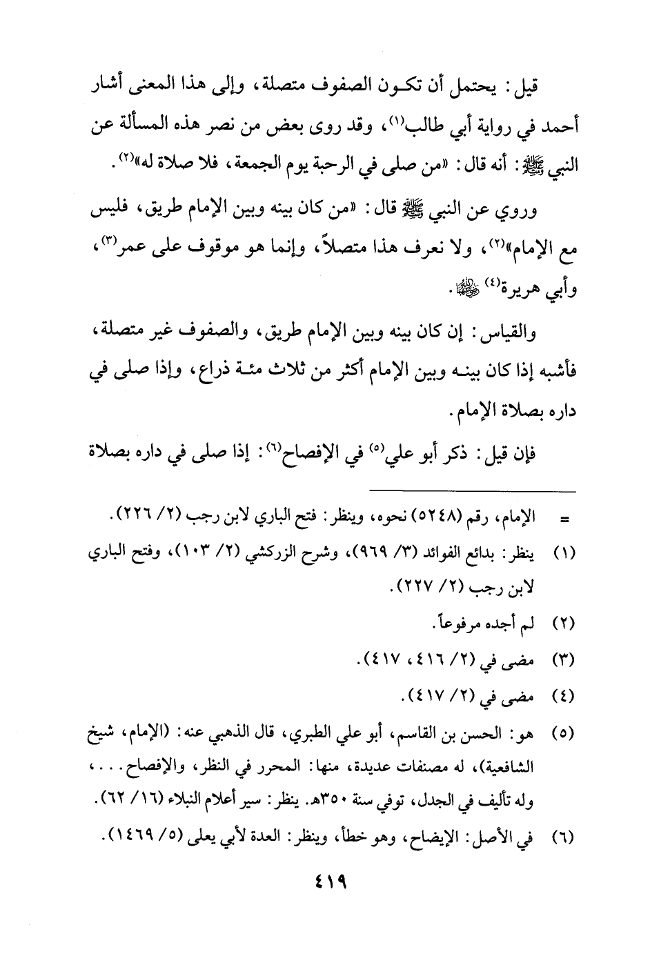 وروي عن النبي - صلى الله عليه وسلم - قال: "من كان بينه وبين الإمام طريق، فليس مع الإمام" (2)، ولا نعرف هذا متصلًا، وإنما هو موقوف على عمر (¬3)، وأبي هريرة (¬4) - رضي الله عنهما -.