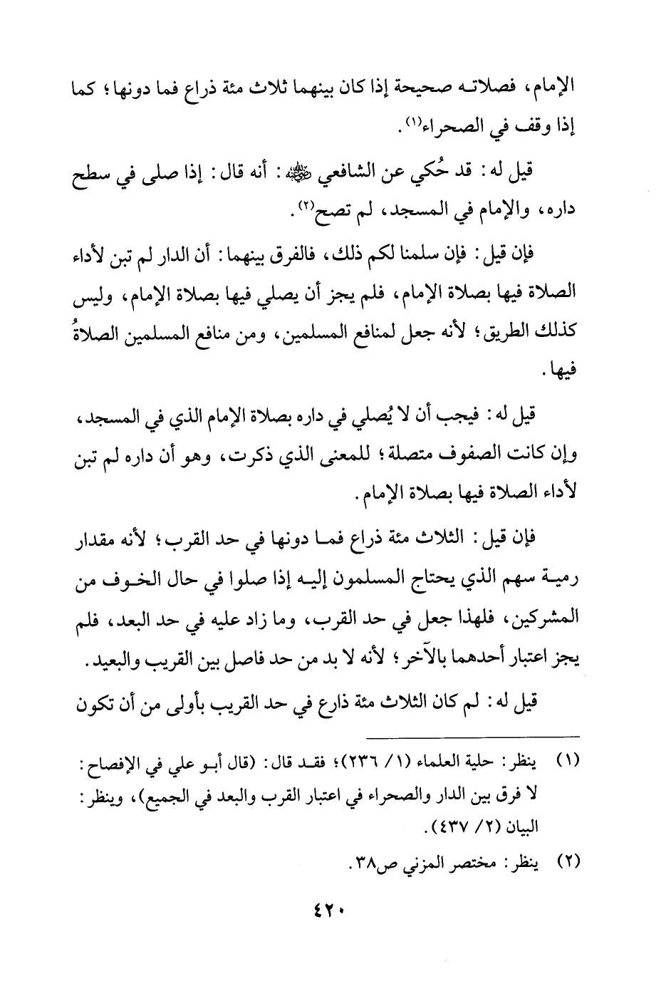 (¬1) ينظر: حلية العلماء (1/ 236)؛ فقد قال: (قال أبو علي في الإفصاح: لا فرق بين الدار والصحراء في اعتبار القرب والبعد في الجميع)، وينظر: البيان (2/ 437).