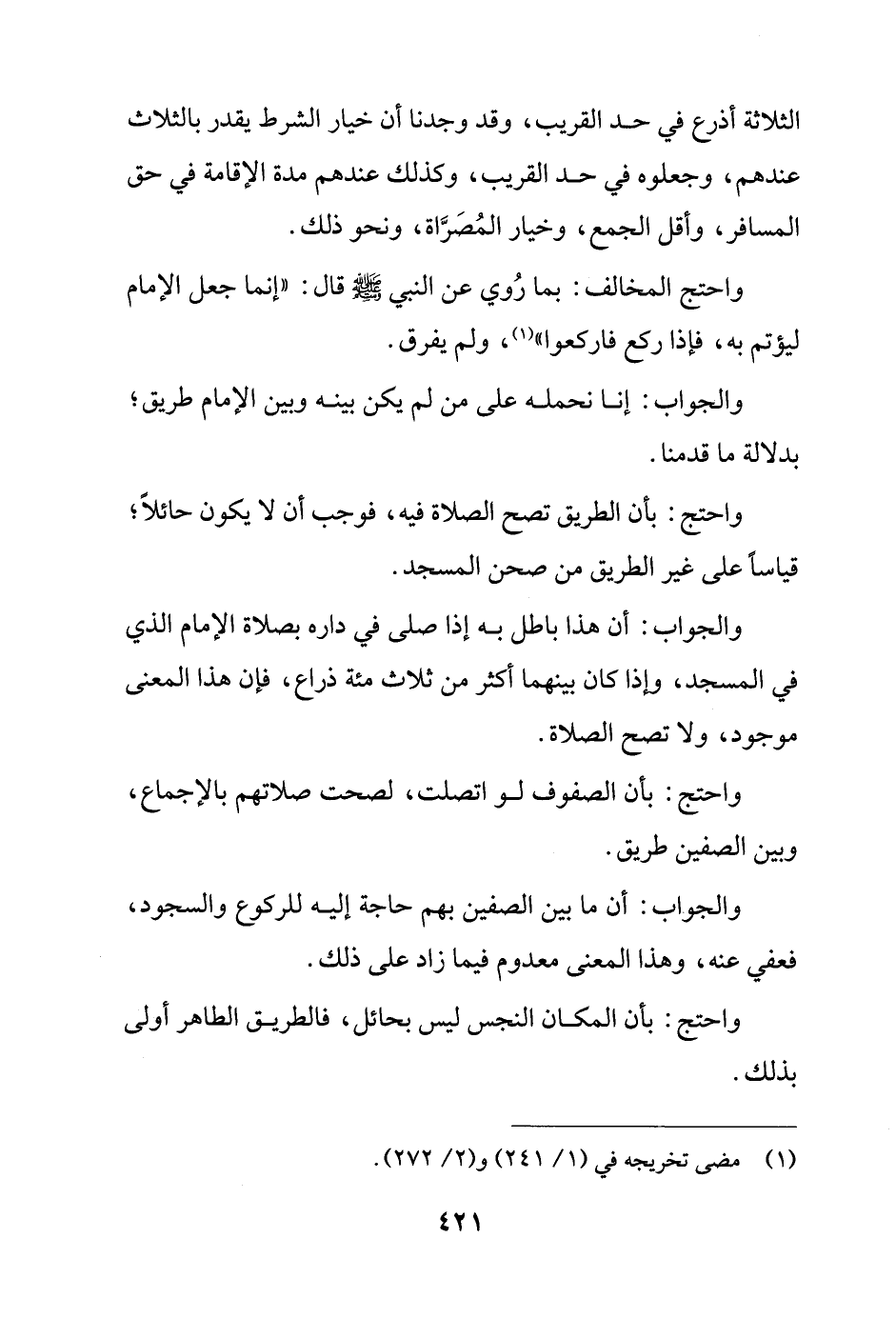 والجواب: أن هذا باطل به إذا صلى في داره بصلاة الإمام الذي في المسجد، وإذا كان بينهما أكثر من ثلاث مئة ذراع، فإن هذا المعنى موجود، ولا تصح الصلاة.