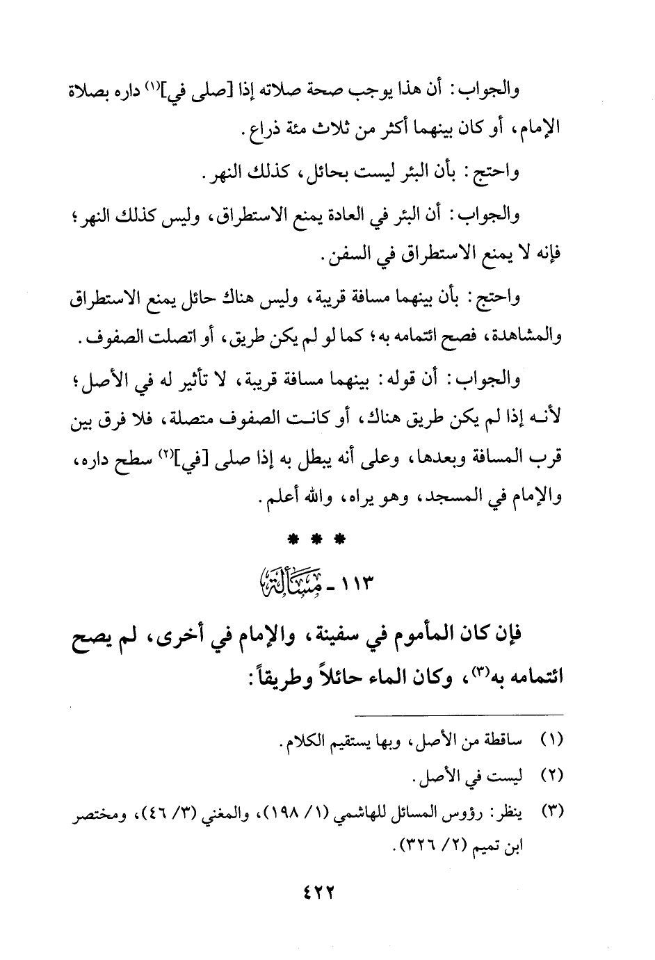 113 - مَسْألَة: فإن كان المأموم في سفينة، والإمام في أخرى، لم يصح ائتمامه به (¬3)، وكان الماء حائلًا وطريقًا: