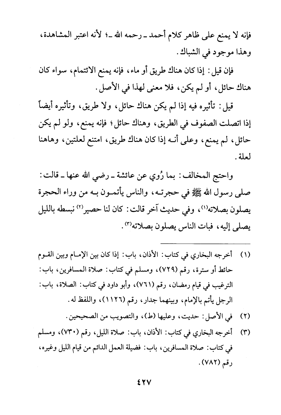 قيل: تأثيره فيه إذا لم يكن هناك حائل، ولا طريق، وتأثيره أيضًا إذا اتصلت الصفوف في الطريق، وهناك حائل؛ فإنه يمنع، ولو لم يكن حائل، لم يمنع، وعلى أنه إذا كان هناك طريق، امتنع لعلتين، وها هنا لعلة.