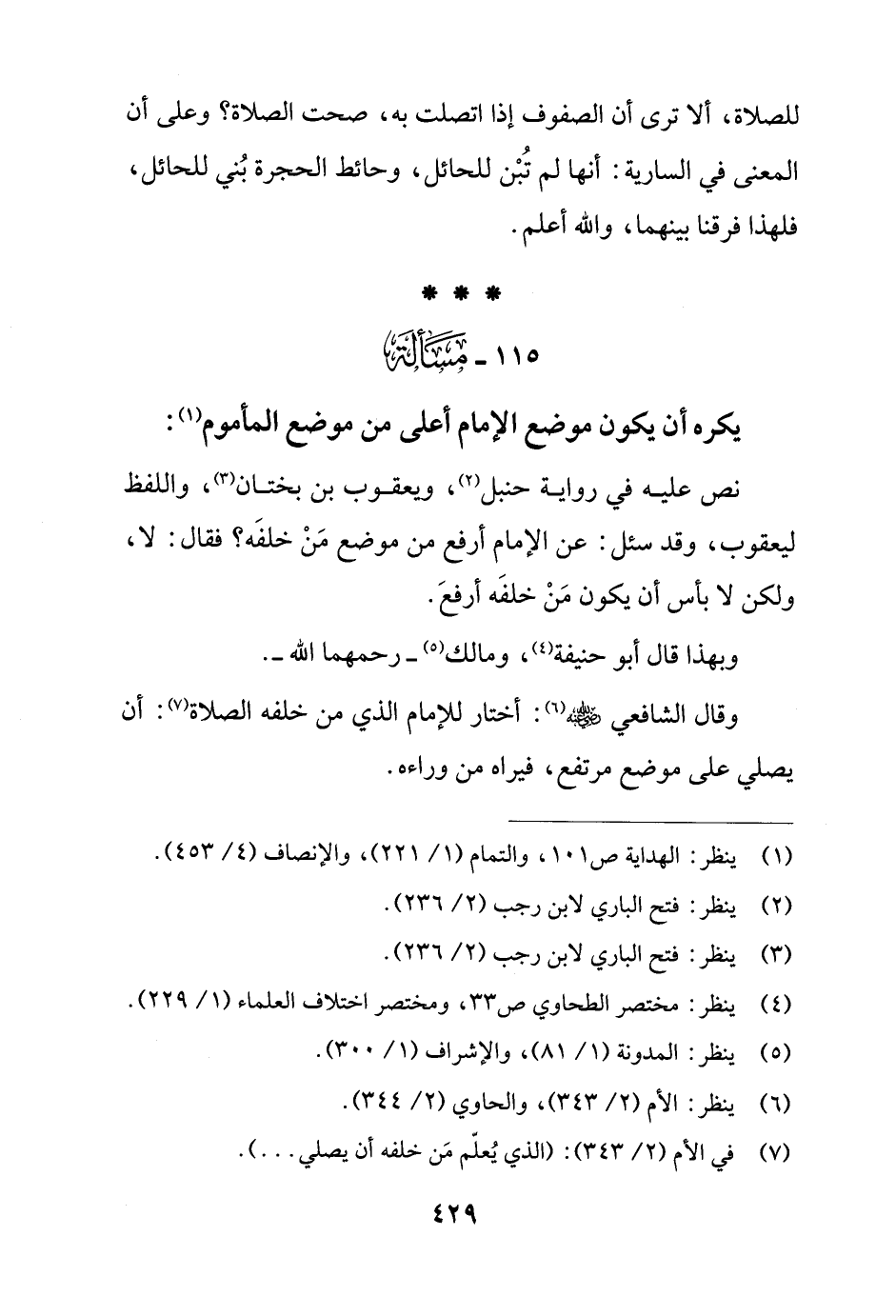 115 - مَسْألَة: يكره أن يكون موضع الإمام أعلى من موضع المأموم (¬1):
