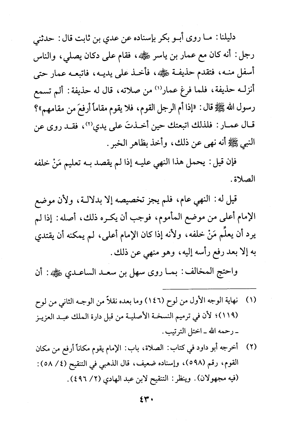 (¬2) أخرجه أبو داود في كتاب: الصلاة، باب: الإمام يقوم مكانًا أرفع من مكان القوم، رقم (598)، وإسناده ضعيف، قال الذهبي في التنقيح (4/ 58): (فيه مجهولان). وينظر: التنقيح لابن عبد الهادي (2/ 496).