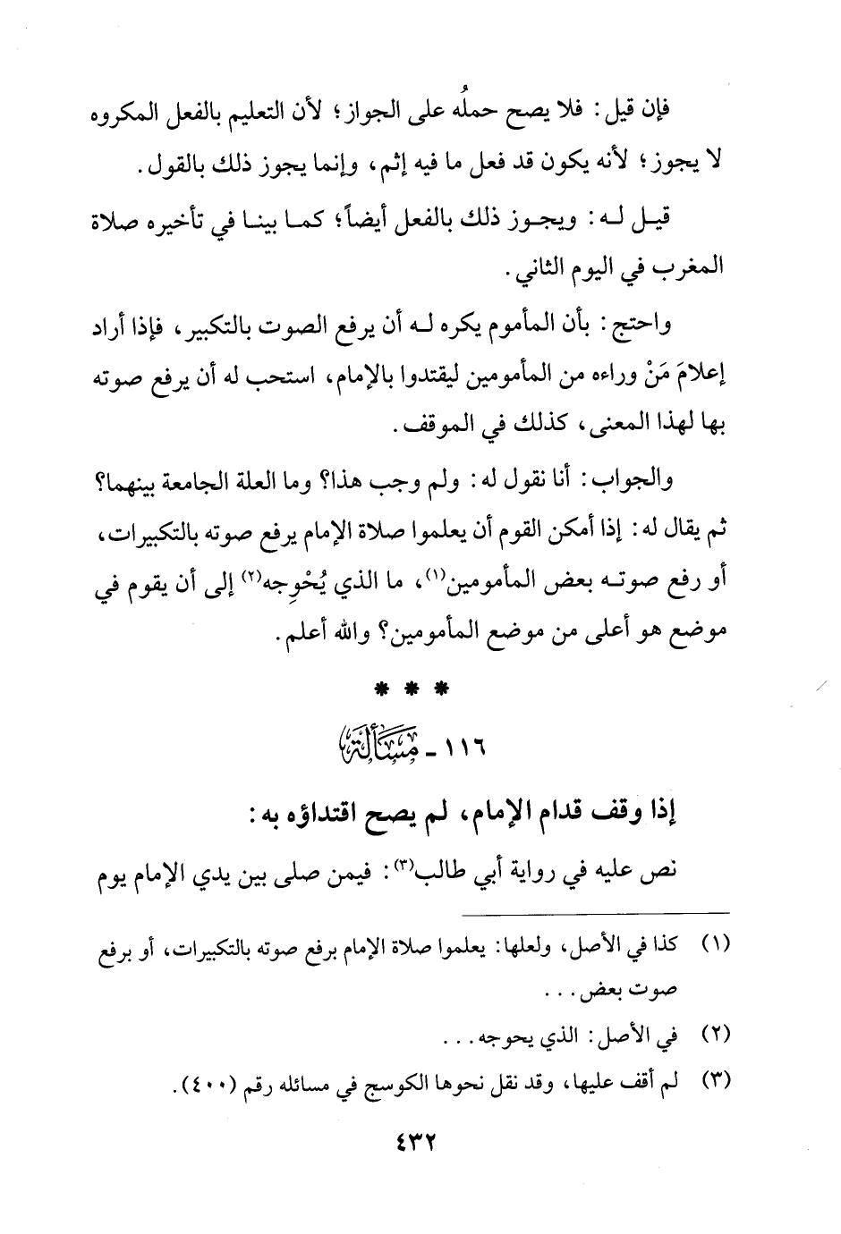 116 - مَسْألَة: إذا وقف قدام الإمام، لم يصح اقتداؤه به: