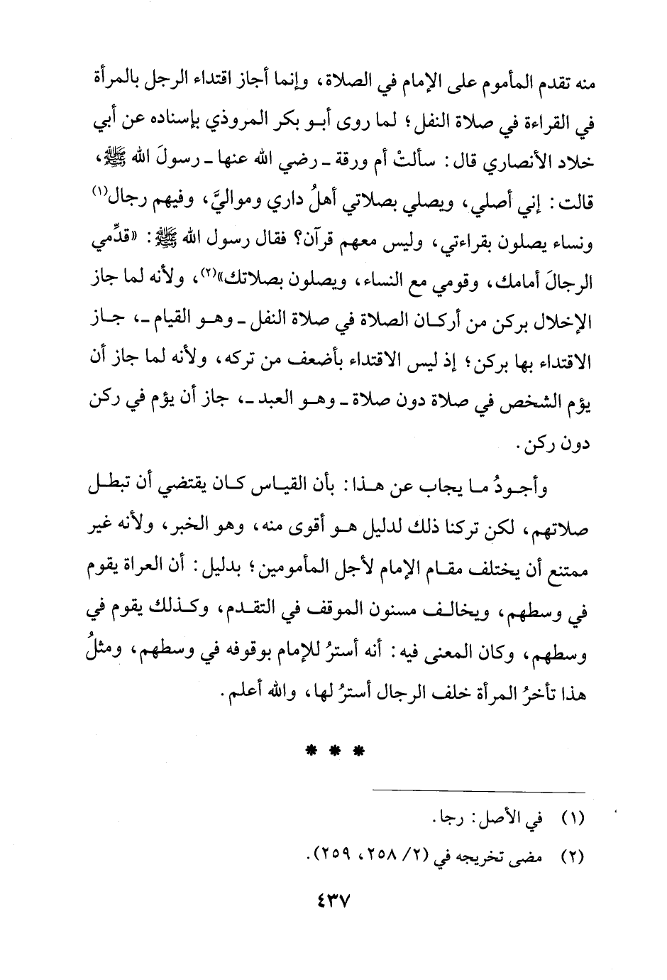 منه تقدم المأموم على الإمام في الصلاة، وإنما أجاز اقتداء الرجل بالمرأة في القراءة في صلاة النفل؛ لما روى أبو بكر المروذي بإسناده عن أبي خلاد الأنصاري قال: سألتْ أم ورقة - رضي الله عنها - رسولَ الله - صلى الله عليه وسلم -، قالت: إني أصلي، ويصلي بصلاتي أهلُ داري ومواليَّ، وفيهم رجال (¬1) ونساء يصلون بقراءتي، وليس معهم قرآن؟ فقال رسول الله - صلى الله عليه وسلم -: "قدِّمي الرجالَ أمامك، وقومي مع النساء، ويصلون بصلاتك" (¬2)، ولأنه لما جاز الإخلال بركن من أركان الصلاة في صلاة النفل - وهو القيام -، جاز الاقتداء بها بركن؛ إذ ليس الاقتداء بأضعف من تركه، ولأنه لما جاز أن يؤم الشخص في صلاة دون صلاة - وهو العبد -، جاز أن يؤم في ركن دون ركن.