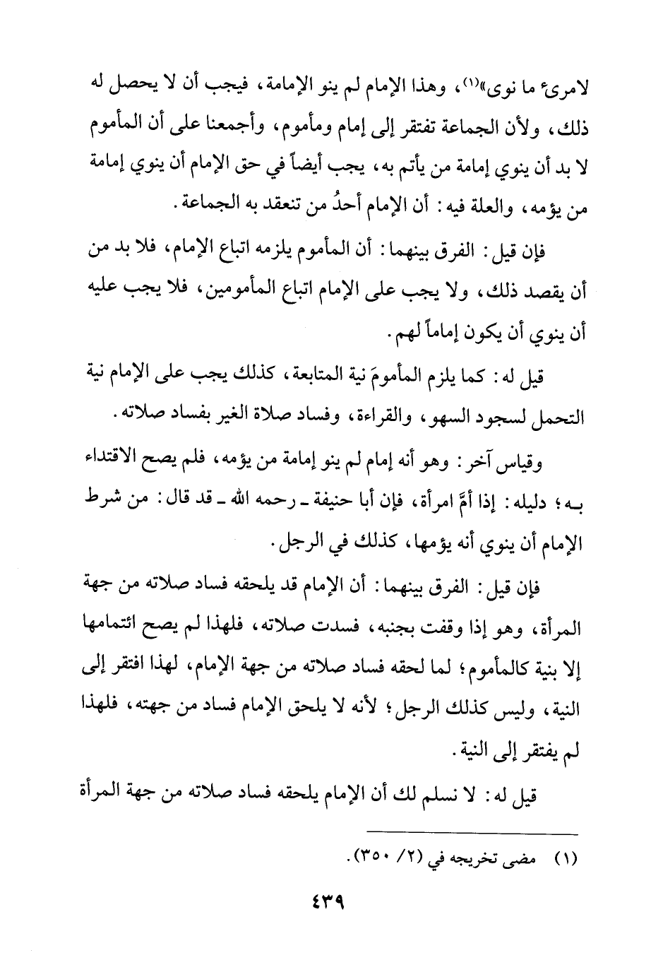 قيل له: كما يلزم المأمومَ نية المتابعة، كذلك يجب على الإمام نية التحمل لسجود السهو، والقراءة، وفساد صلاة الغير بفساد صلاته.