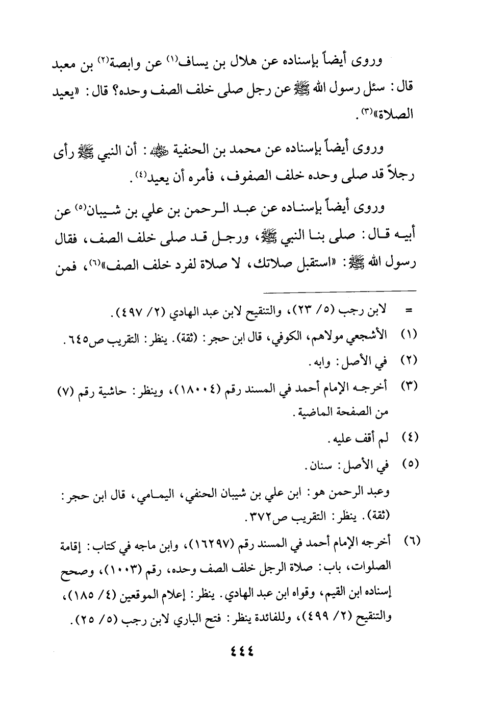 (¬6) أخرجه الإمام أحمد في المسند رقم (16297)، وابن ماجه في كتاب: إقامة الصلوات، باب: صلاة الرجل خلف الصف وحده، رقم (1003)، وصحح إسناده ابن القيم، وقواه ابن عبد الهادي. ينظر: إعلام الموقعين (4/ 185)، والتنقيح (2/ 499)، وللفائدة ينظر: فتح الباري لابن رجب (5/ 25).
