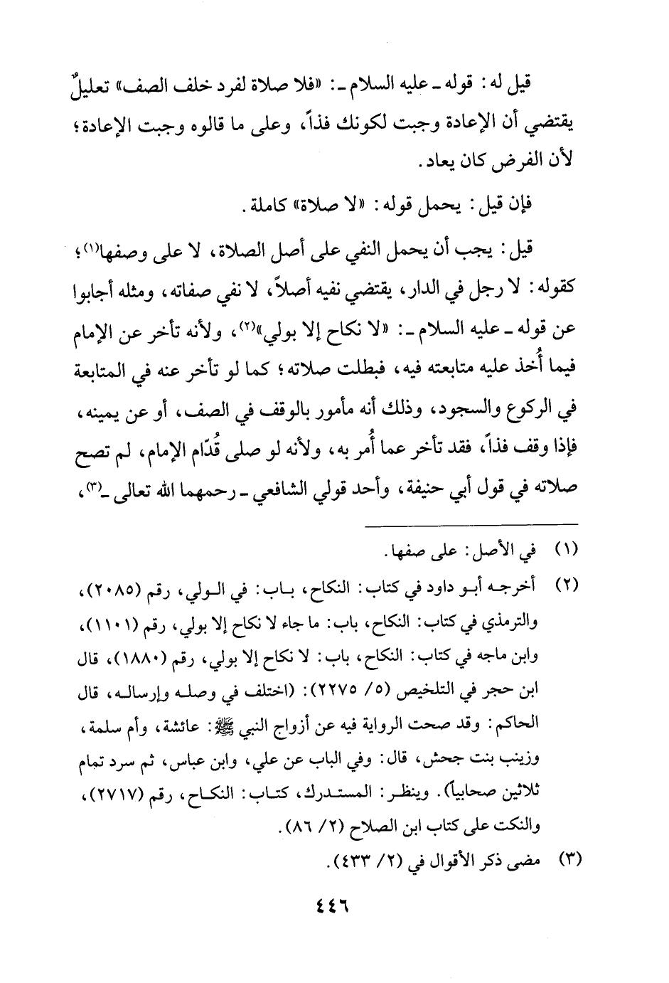 قيل: يجب أن يحمل النفي على أصل الصلاة، لا على وصفها (¬1)؛ كقوله: لا رجل في الدار، يقتضي نفيه أصلًا، لا نفي صفاته، ومثله أجابوا عن قوله - عليه السلام -: "لا نكاح إلا بولي" (¬2)، ولأنه تأخر عن الإمام فيما أُخذ عليه متابعته فيه، فبطلت صلاته؛ كما لو تأخر عنه في المتابعة في الركوع والسجود، وذلك أنه مأمور بالوقف في الصف، أو عن يمينه، فإذا وقف فذًا، فقد تأخر عما أُمر به، ولأنه لو صلى قُدّام الإمام، لم تصح صلاته في قول أبي حنيفة، وأحد قولي الشافعي - رحمهما الله تعالى - (¬3)،