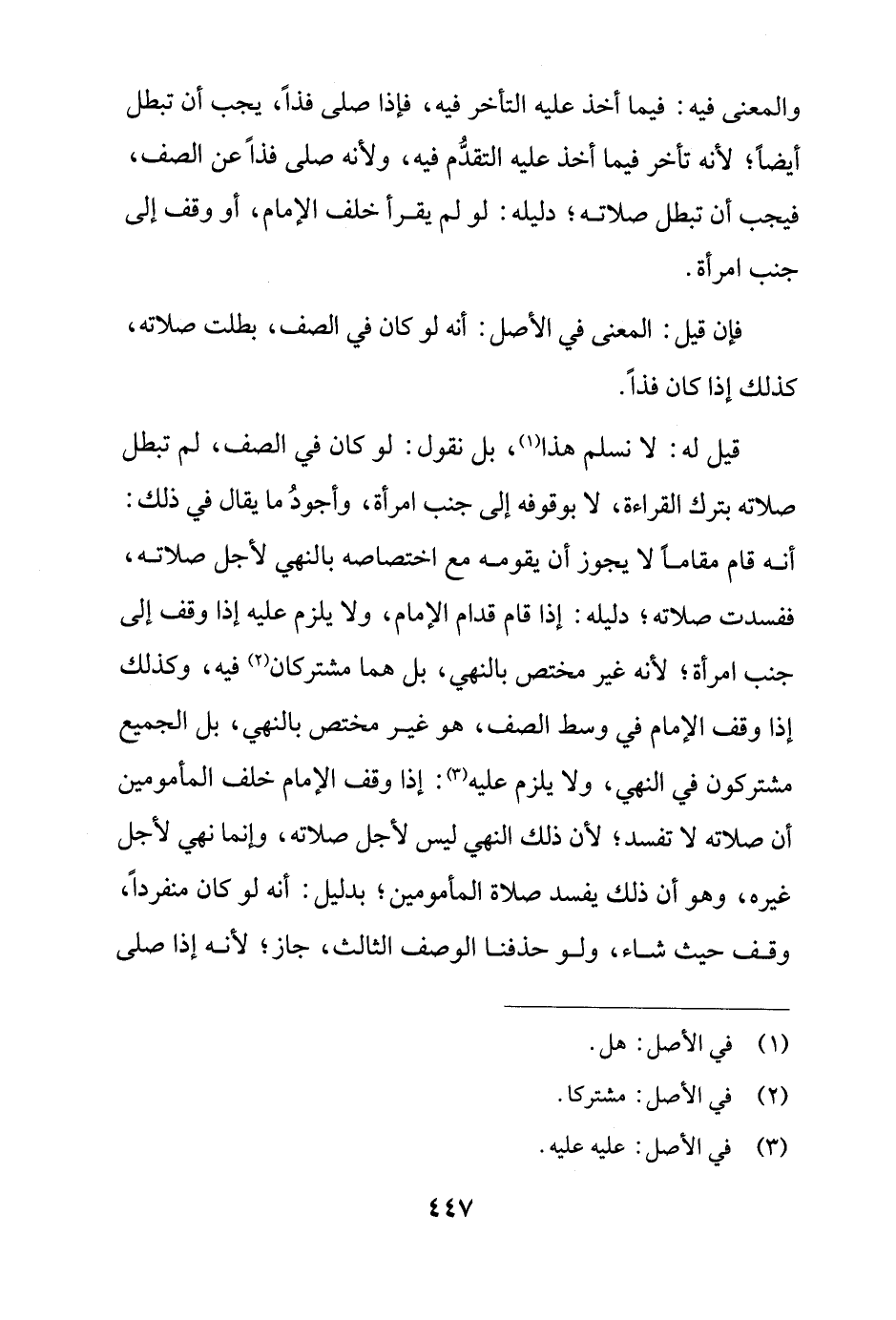 قيل له: لا نسلم هذا (¬1)، بل نقول: لو كان في الصف، لم تبطل صلاته بترك القراءة، لا بوقوفه إلى جنب امرأة، وأجودُ ما يقال في ذلك: أنه قام مقامًا لا يجوز أن يقومه مع اختصاصه بالنهي لأجل صلاته، ففسدت صلاته؛ دليله: إذا قام قدام الإمام، ولا يلزم عليه إذا وقف إلى جنب امرأة؛ لأنه غير مختص بالنهي، بل هما مشتركان (¬2) فيه، وكذلك إذا وقف الإمام في وسط الصف، هو غير مختص بالنهي، بل الجميع مشتركون في النهي، ولا يلزم عليه (¬3): إذا وقف الإمام خلف المأمومين أن صلاته لا تفسد؛ لأن ذلك النهي ليس لأجل صلاته، وإنما نهي لأجل غيره، وهو أن ذلك يفسد صلاة المأمومين؛ بدليل: أنه لو كان منفردًا، وقف حيث شاء، ولو حذفنا الوصف الثالث، جاز؛ لأنه إذا صلى