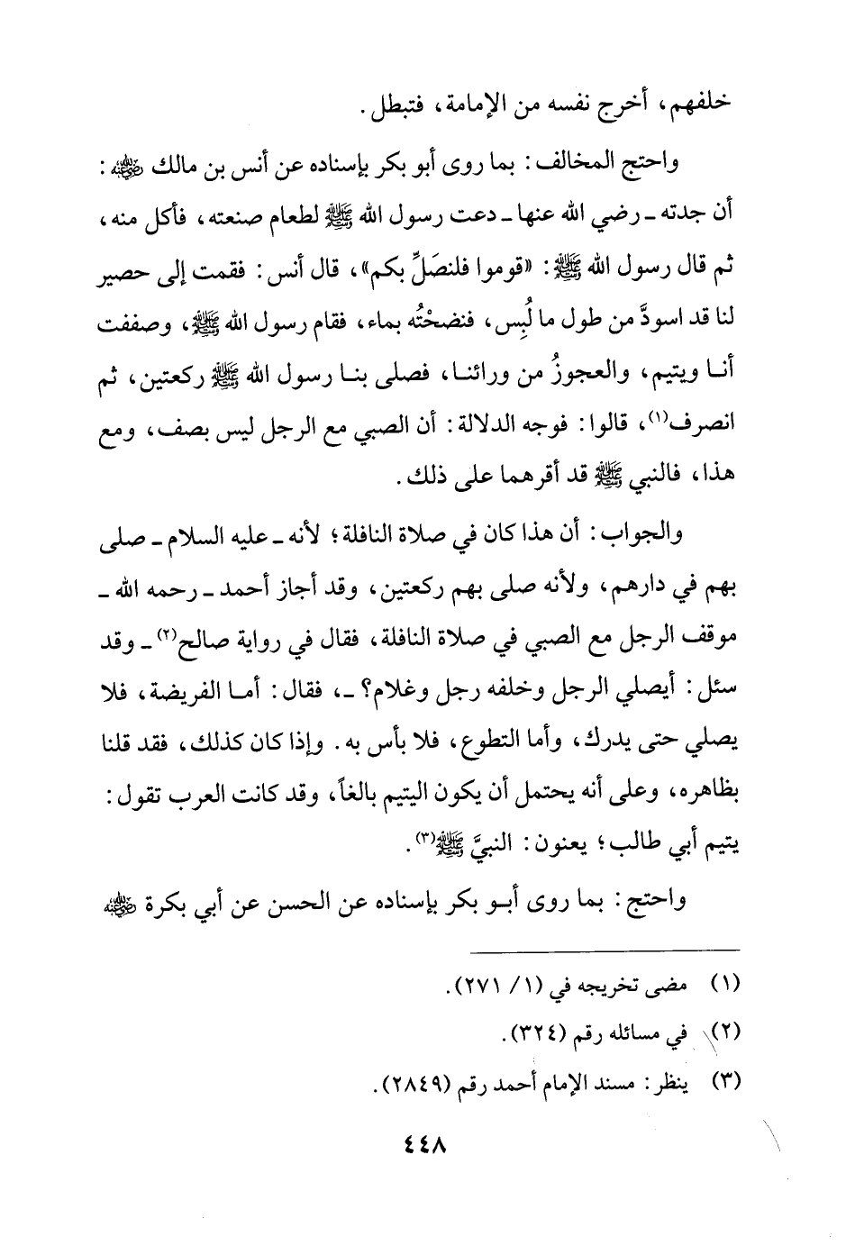 والجواب: أن هذا كان في صلاة النافلة؛ لأنه - عليه السلام - صلى بهم في دارهم، ولأنه صلى بهم ركعتين، وقد أجاز أحمد - رحمه الله - موقف الرجل مع الصبي في صلاة النافلة، فقال في رواية صالح (¬2) - وقد سئل: أيصلي الرجل وخلفه رجل وغلام؟ -، فقال: أما الفريضة، فلا يصلي حتى يدرك، وأما التطوع، فلا بأس به. وإذا كان كذلك، فقد قلنا بظاهره، وعلى أنه يحتمل أن يكون اليتيم بالغًا، وقد كانت العرب تقول: يتيم أبي طالب؛ يعنون: النبيَّ - صلى الله عليه وسلم - (¬3).
