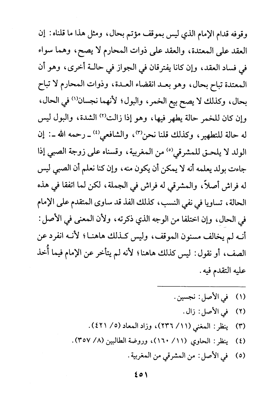 وقوفه قدام الإمام الذي ليس بموقف مؤتم بحال، ومثل هذا ما قلناه: إن العقد على المعتدة، والعقد على ذوات المحارم لا يصح، وهما سواء في فساد العقد، وإن كانا يفترقان في الجواز في حالة أخرى، وهو أن المعتدة تباح بحال، وهو بعد انقضاء العدة، وذوات المحارم لا تباح بحال، وكذلك لا يصح بيع الخمر، والبول؛ لأنهما نجسان (¬1) في الحال، وإن كان للخمر حالة يطهر فيها، وهو إذا زالت (¬2) الشدة، والبول ليس له حالة للتطهير، وكذلك قلنا نحن (¬3)، والشافعي (¬4) - رحمه الله -: إن الولد لا يلحق للمشرقي (¬5) من المغربية، وقسناه على زوجة الصبي إذا جاءت بولد يعلمه أنه لا يمكن أن يكون منه، وإن كنا نعلم أن الصبي ليس له فراش أصلًا، والمشرقي له فراش في الجملة، لكن لما اتفقا في هذه الحالة، تساويا في نفي النسب، كذلك الفذ قد ساوى المتقدم على الإمام في الحال، وإن اختلفا من الوجه الذي ذكرته، ولأن المعنى في الأصل: أنه لم يخالف مسنون الموقف، وليس كذلك ها هنا؛ لأنه انفرد عن الصف، أو نقول: ليس كذلك ها هنا؛ لأنه لم يتأخر عن الإمام فيما أُخذ عليه التقدم فيه.