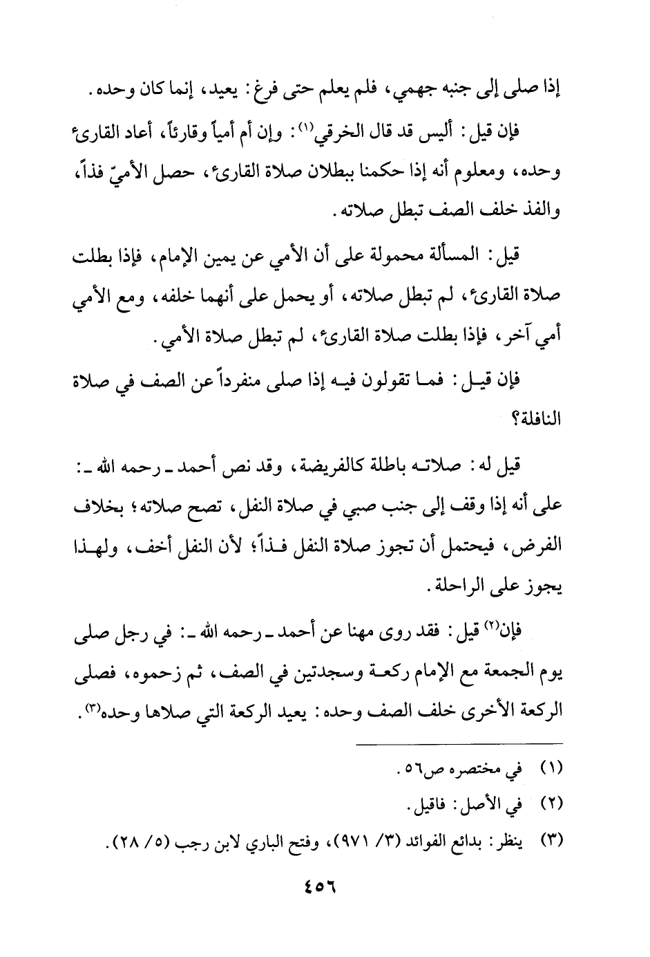 قيل له: صلاته باطلة كالفريضة، وقد نص أحمد - رحمه الله -: على أنه إذا وقف إلى جنب صبي في صلاة النفل، تصح صلاته؛ بخلاف الفرض، فيحتمل أن تجوز صلاة النفل فذًا؛ لأن النفل أخف، ولهذا يجوز على الراحلة.