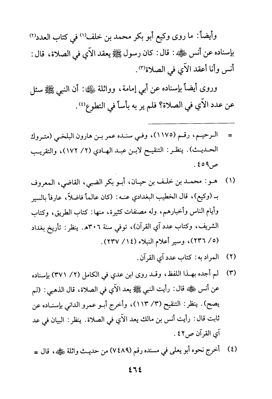 وأيضًا: ما روى وكيع أبو بكر محمد بن خلف (¬1) في كتاب العدد (¬2) بإسناده عن أنس - رضي الله عنه -: قال: كان رسول - صلى الله عليه وسلم - يعقد الآي في الصلاة، قال: أنس وأنا أعقد الآي في الصلاة (¬3).