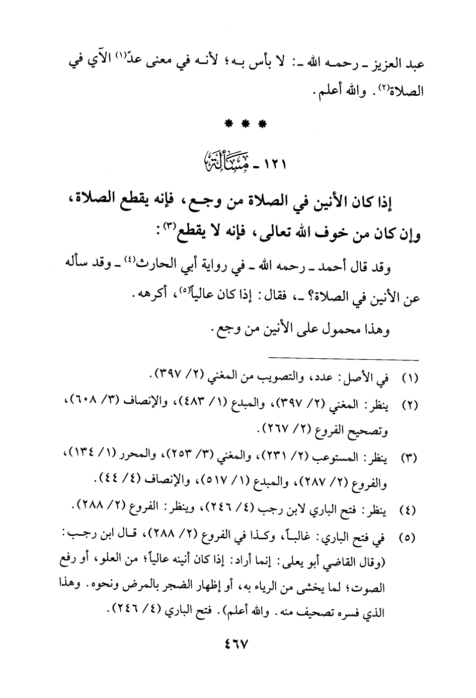 121 - مَسْألَة: إذا كان الأنين في الصلاة من وجع، فإنه يقطع الصلاة، وإن كان من خوف الله تعالى، فإنه لا يقطع (¬3):