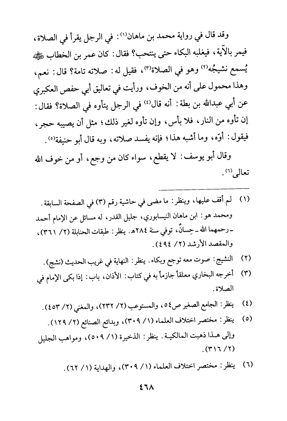 وقد قال في رواية محمد بن ماهان (¬1): في الرجل يقرأ في الصلاة، فيمر بالآية، فيغلبه البكاء حتى ينتحب؟ فقال: كان عمر بن الخطاب - رضي الله عنه - يُسمع نشيجُه (¬2) وهو في الصلاة (¬3)، فقيل له: صلاته تامة؟ قال: نعم، وهذا محمول على أنه من الخوف، ورأيت في تعاليق أبي حفص العكبري عن أبي عبد الله بن بطة: أنه قال (¬4) في الرجل يتأوه في الصلاة؟ فقال: إن تأوه من النار، فلا بأس، وإن تأوه لغير ذلك؛ مثل أن يصيبه حجر، فيقول: أوّه، وما أشبه هذا؛ فإنه يفسد صلاته، وبه قال أبو حنيفة (¬5).