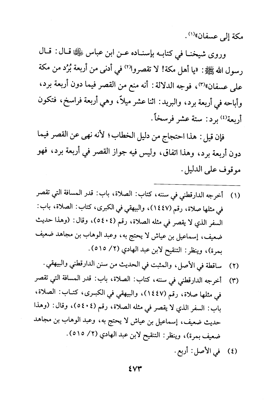 وروى شيخنا في كتابه بإسناده عن ابن عباس - رضي الله عنهما - قال: قال رسول الله - صلى الله عليه وسلم -: "يا أهل مكة! لا تقصروا (¬2) في أدنى من أربعة بُرُد من مكة على عسفان" (¬3)، فوجه الدلالة: أنه منع من القصر فمِما دون أربعة برد، وأباحه في أربعة برد، والبريد: اثنا عشر ميلًا، وهي أربعة فراسخ، فتكون أربعة (¬4) برد: ستة عشر فرسخًا.