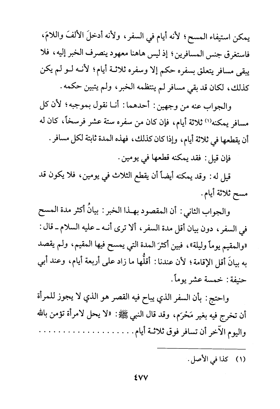 يمكن استيفاء المسح؛ لأنه أيام في السفر، ولأنه أدخلَ الألفَ واللامَ، فاستغرق جنس المسافرين؛ إذ ليس ها هنا معهود ينصرف الخبر إليه، فلا يبقى مسافر يتعلق بسفره حكم إلا وسفره ثلاثة أيام؛ لأنه لو لم يكن كذلك، لكان قد بقي مسافر لم ينتظمه الخبر، ولم يتبين حكمه.