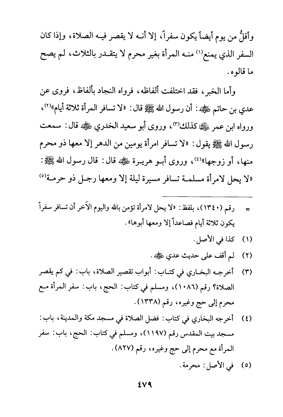 = رقم (1340)، بلفظ: "لا يحل لامرأة تؤمن بالله واليوم الآخر أن تسافر سفرًا يكون ثلاثة أيام فصاعدًا إلا ومعها أبوها".