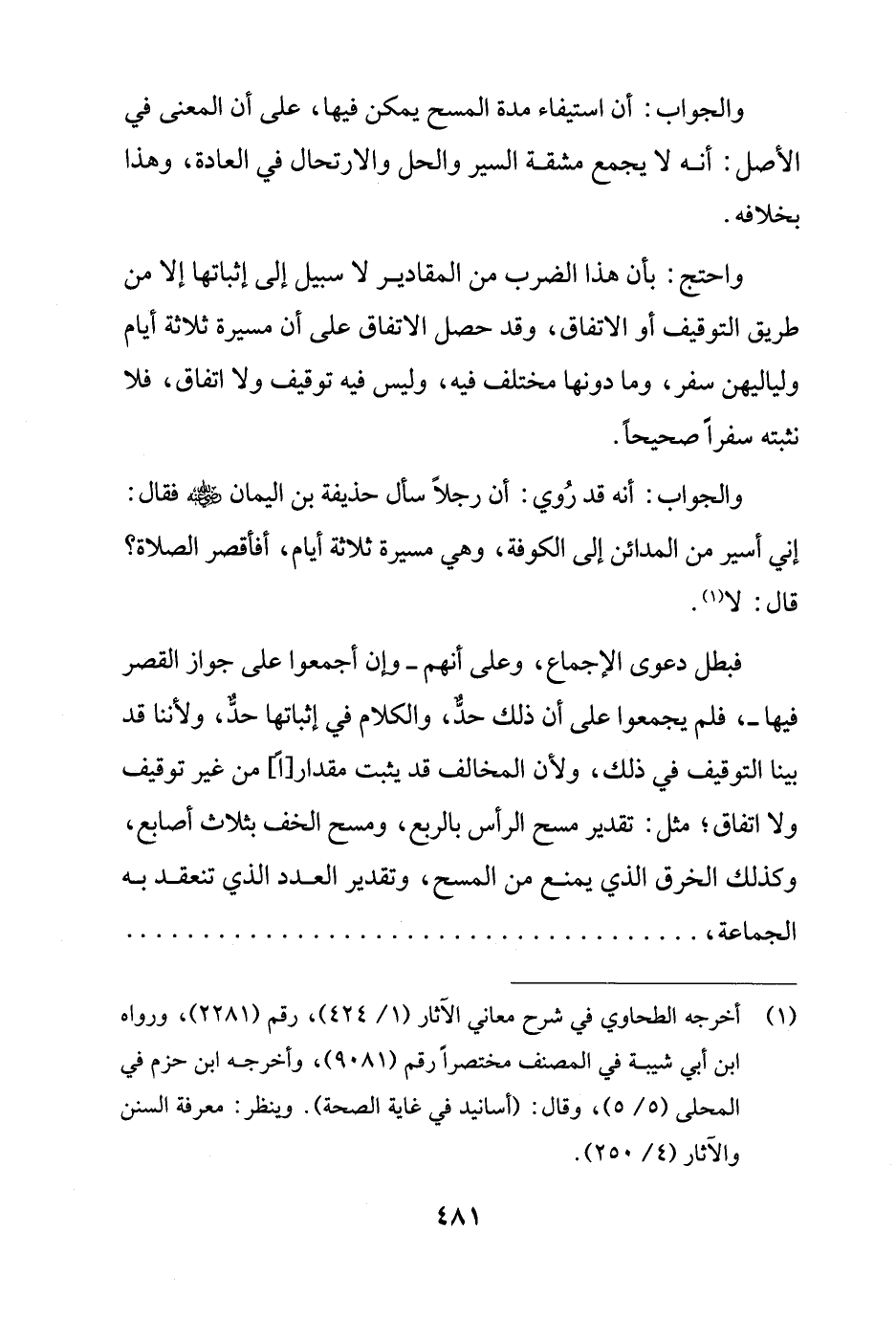 واحتج: بأن هذا الضرب من المقادير لا سبيل إلى إثباتها إلا من طريق التوقيف أو الاتفاق، وقد حصل الاتفاق على أن مسيرة ثلاثة أيام ولياليهن سفر، وما دونها مختلف فيه، وليس فيه توقيف ولا اتفاق، فلا نثبته سفرًا صحيحًا.