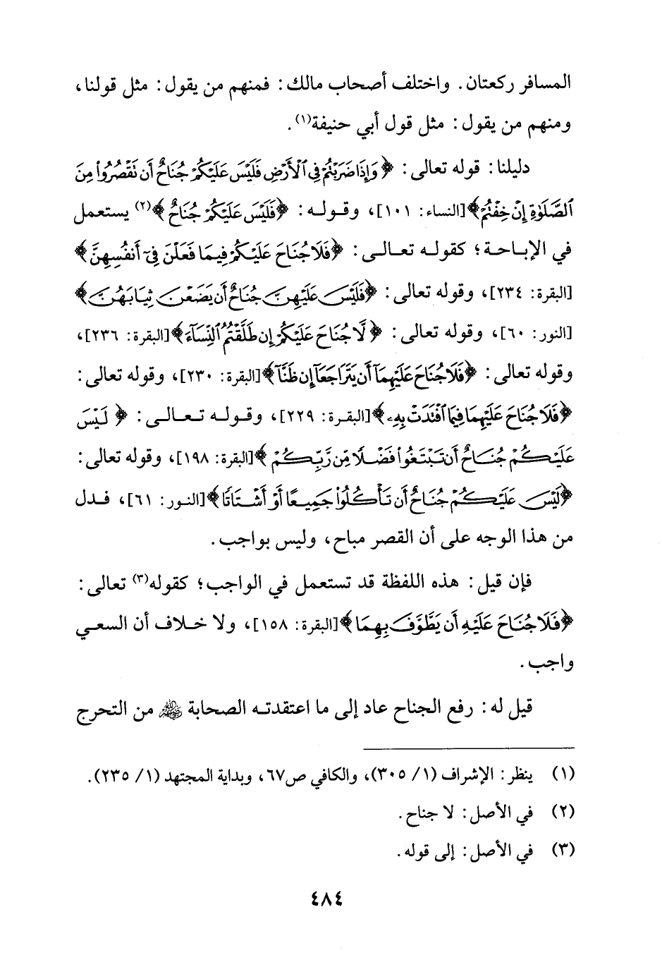 دليلنا: قوله تعالى: {وَإِذَا ضَرَبْتُمْ فِي الْأَرْضِ فَلَيْسَ عَلَيْكُمْ جُنَاحٌ أَنْ تَقْصُرُوا مِنَ الصَّلَاةِ إِنْ خِفْتُمْ} [النساء: 101]، وقوله: {فَلَيْسَ عَلَيْكُمْ جُنَاحٌ} (¬2) يستعمل في الإباحة؛ كقوله تعالى: {فَلَا جُنَاحَ عَلَيْكُمْ فِيمَا فَعَلْنَ فِي أَنْفُسِهِنَّ} [البقرة: 234]، وقوله تعالى: {فَلَيْسَ عَلَيْهِنَّ جُنَاحٌ أَنْ يَضَعْنَ ثِيَابَهُنَّ} [النور: 60]، وقوله تعالى: {لَا جُنَاحَ عَلَيْكُمْ إِنْ طَلَّقْتُمُ النِّسَاءَ} [البقرة: 236]، وقوله تعالى: {فَلَا جُنَاحَ عَلَيْهِمَا أَنْ يَتَرَاجَعَا إِنْ ظَنَّا} [البقرة: 230]، وقوله تعالى: {فَلَا جُنَاحَ عَلَيْهِمَا فِيمَا افْتَدَتْ بِهِ} [البقرة: 229] , وقوله تعالى: {لَيْسَ عَلَيْكُمْ جُنَاحٌ أَنْ تَبْتَغُوا فَضْلًا مِنْ رَبِّكُمْ} [البقرة: 198]، وقوله تعالى: {لَيْسَ عَلَيْكُمْ جُنَاحٌ أَنْ تَأْكُلُوا جَمِيعًا أَوْ أَشْتَاتًا} [النور: 61]، فدل من هذا الوجه على أن القصر مباح، وليس بواجب.