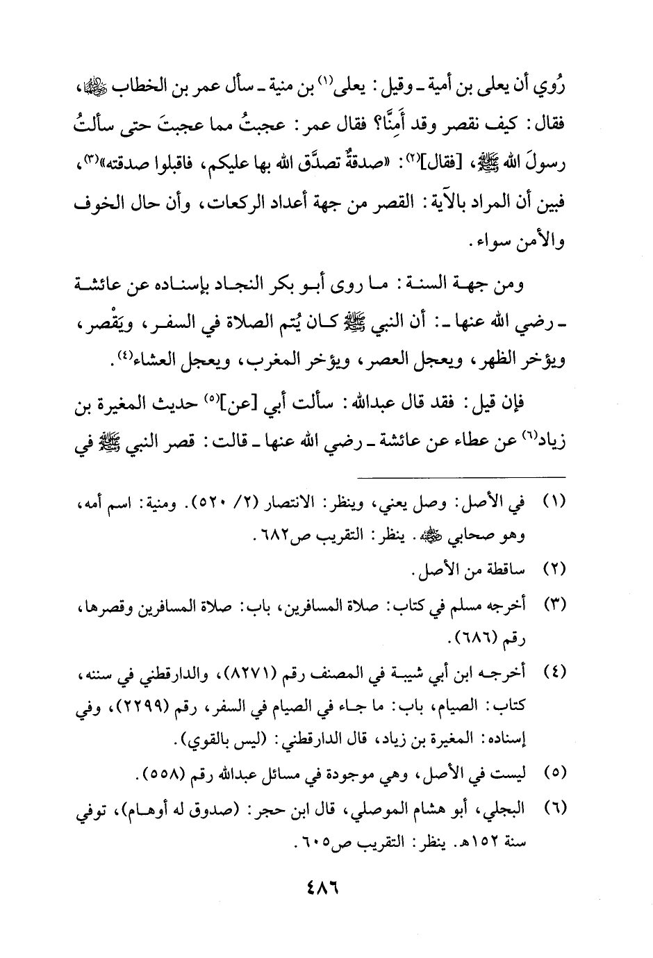 ومن جهة السنة: ما روى أبو بكر النجاد بإسناده عن عائشة - رضي الله عنها -: أن النبي - صلى الله عليه وسلم - كان يُتم الصلاة في السفر، ويَقْصر، ويؤخر الظهر، ويعجل العصر، ويؤخر المغرب، ويعجل العشاء (¬4).