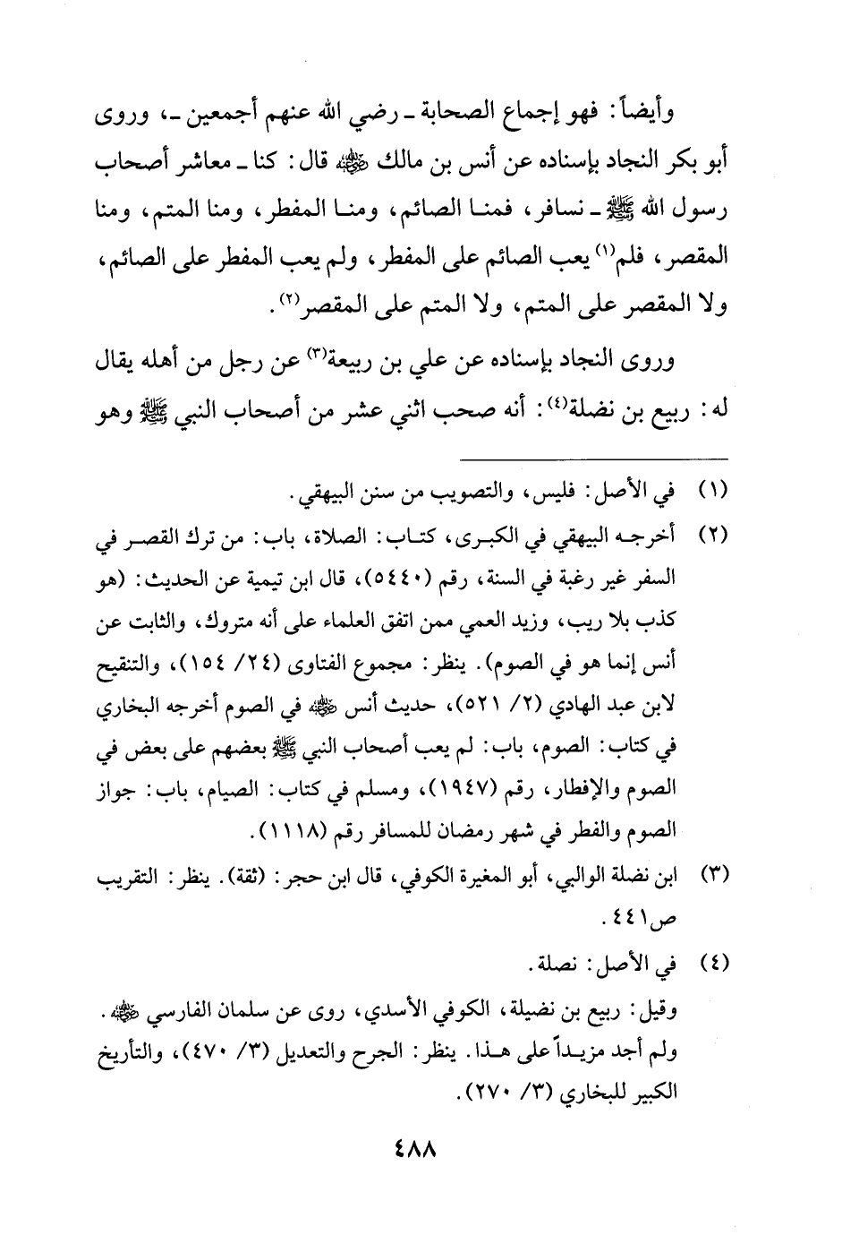 وأيضًا: فهو إجماع الصحابة - رضي الله عنهم أجمعين -، وروى أبو بكر النجاد بإسناده عن أنس بن مالك - رضي الله عنه - قال: كنا - معاشر أصحاب رسول الله - صلى الله عليه وسلم - نسافر، فمنا الصائم، ومنا المفطر، ومنا المتم، ومنا المقصر، فلم (¬1) يعب الصائم على المفطر، ولم يعب المفطر على الصائم، ولا المقصر على المتم، ولا المتم على المقصر (¬2).