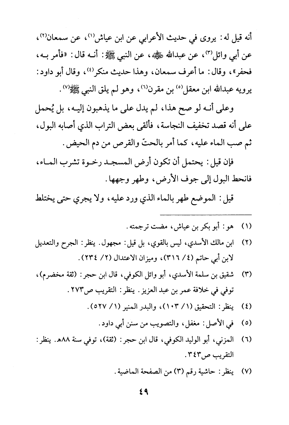 أنه قيل له: يروى في حديث الأعرابي عن ابن عياش (¬1)، عن سمعان (¬2)، عن أبي وائل (¬3)، عن عبد الله - رضي الله عنه -، عن النبي - صلى الله عليه وسلم -: أنه قال: "فأمر به، فحفر"، وقال: ما أعرف سمعان، وهذا حديث منكر (¬4)، وقال أبو داود: يرويه عبد الله بن معقل (¬5) بن مقرن (¬6)، وهو لم يلق النبي - صلى الله عليه وسلم - (¬7).