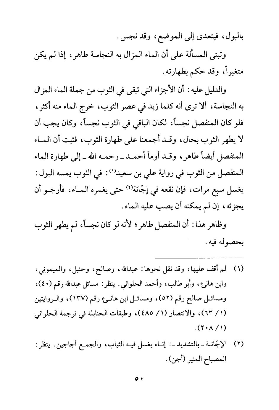 والدليل عليه: أن الأجزاء التي تبقى في الثوب من جملة الماء المزال به النجاسة، ألا ترى أنه كلما زيد في عصر الثوب، خرج الماء منه أكثر، فلو كان المنفصل نجسًا، لكان الباقي في الثوب نجسًا، وكان يجب أن لا يطهر الثوب بحال، وقد أجمعنا على طهارة الثوب، فثبت أن الماء المنفصل أيضًا طاهر، وقد أومأ أحمد - رحمه الله - إلى طهارة الماء المنفصل من الثوب في رواية علي بن سعيد (¬1): في الثوب يمسه البول: يغسل سبع مرات، فإن نقعه في إجّانة (¬2) حتى يغمره الماء، فأرجو أن يجزئه، إن لم يمكنه أن يصب عليه الماء.