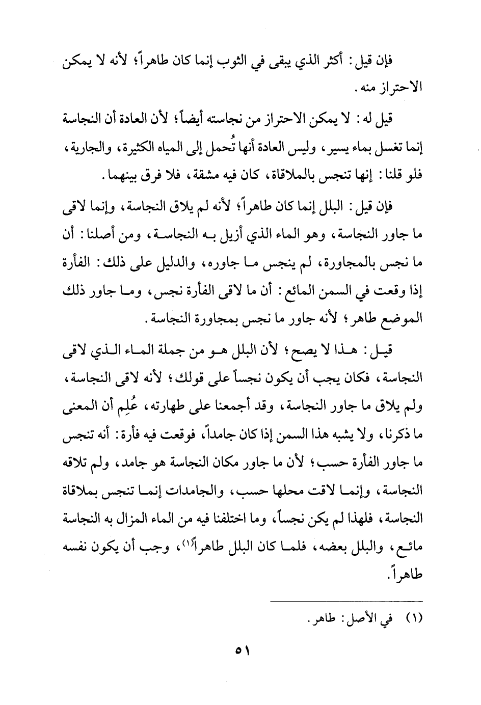 قيل: هذا لا يصح؛ لأن البلل هو من جملة الماء الذي لاقى النجاسة، فكان يجب أن يكون نجسًا على قولك؛ لأنه لاقى النجاسة، ولم يلاق ما جاور النجاسة، وقد أجمعنا على طهارته، عُلِم أن المعنى ما ذكرنا، ولا يشبه هذا السمن إذا كان جامدًا، فوقعت فيه فأرة: أنه تنجس ما جاور الفأرة حسب؛ لأن ما جاور مكان النجاسة هو جامد، ولم تلاقه النجاسة، وإنما لاقت محلها حسب، والجامدات إنما تنجس بملاقاة النجاسة، فلهذا لم يكن نجسًا، وما اختلفنا فيه من الماء المزال به النجاسة مائع، والبلل بعضه، فلما كان البلل طاهرًا (¬1)، وجب أن يكون نفسه طاهرًا.