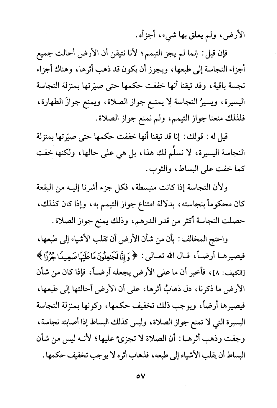 واحتج المخالف: بأن من شأن الأرض أن تقلب الأشياء إلى طبعها، فيصيرها أرضًا، قال الله تعالى: {وَإِنَّا لَجَاعِلُونَ مَا عَلَيْهَا صَعِيدًا جُرُزًا} [الكهف: 8]، فأخبر أن ما على الأرض يجعله أرضًا، فإذا كان من شأن الأرض ما ذكرنا، دل ذهابُ أثرها، على أن الأرض أحالتها إلى طبعها، فيصيرها أرضًا، ويوجب ذلك تخفيف حكمها، وكونها بمنزلة النجاسة اليسيرة التي لا تمنع جواز الصلاة، وليس كذلك البساط إذا أصابته نجاسة، وجفت وذهب أثرها: أن الصلاة لا تجزئ عليها؛ لأنه ليس من شأن البساط أن يقلب الأشياء إلى طبعه، فذهاب أثره لا يوجب تخفيف حكمها.