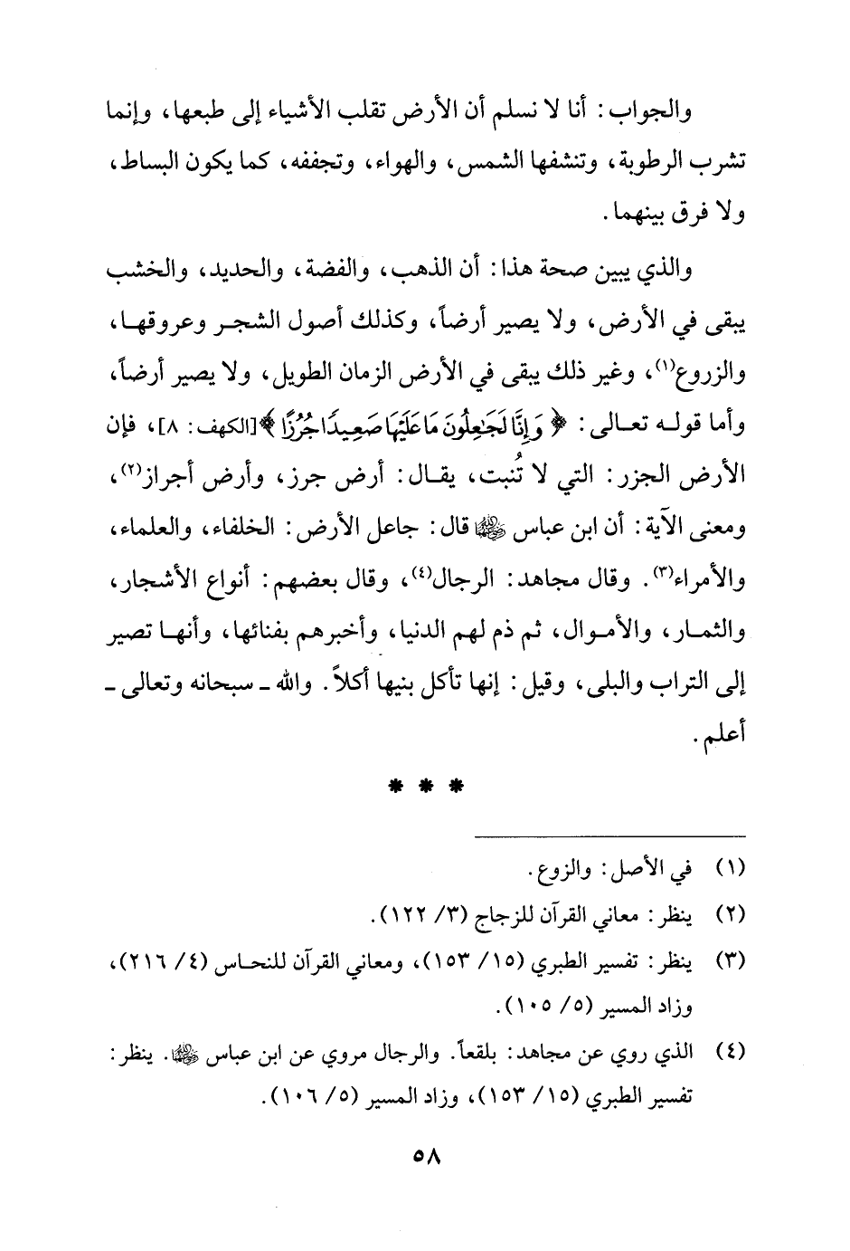 والذي يبين صحة هذا: أن الذهب، والفضة، والحديد، والخشب يبقى في الأرض، ولا يصير أرضًا، وكذلك أصول الشجر وعروقها، والزروع (¬1)، وغير ذلك يبقى في الأرض الزمان الطويل، ولا يصير أرضًا، وأما قوله تعالى: {وَإِنَّا لَجَاعِلُونَ مَا عَلَيْهَا صَعِيدًا جُرُزًا} [الكهف: 8]، فإن الأرض الجزر: التي لا تُنبت، يقال: أرض جرز، وأرض أجراز (¬2)، ومعنى الآية: أن ابن عباس - رضي الله عنهما - قال: جاعل الأرض: الخلفاء، والعلماء، والأمراء (¬3). وقال مجاهد: الرجال (¬4)، وقال بعضهم: أنواع الأشجار، والثمار، والأموال، ثم ذم لهم الدنيا، وأخبرهم بفنائها، وأنها تصير إلى التراب والبلى، وقيل: إنها تأكل بنيها أكلًا. والله - سبحانه وتعالى - أعلم.