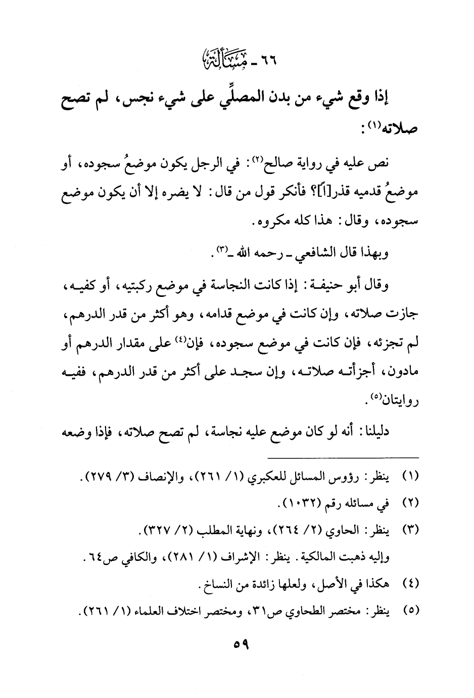 66 - مَسْألَة: إذا وقع شيء من بدن المصلِّي على شيء نجس، لم تصح صلاته (¬1):