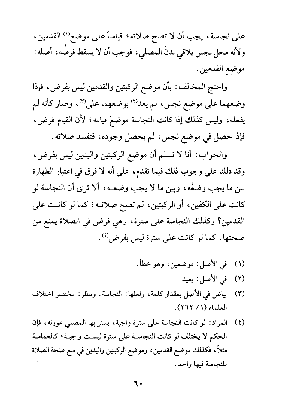 والجواب: أنا لا نسلم أن موضع الركبتين واليدين ليس بفرض، وقد دللنا على وجوب ذلك فيما تقدم، على أنه لا فرق في اعتبار الطهارة بين ما يجب وضعُه، وبين ما لا يجب وضعه، ألا ترى أن النجاسة لو كانت على الكفين، أو الركبتين، لم تصح صلاته؛ كما لو كانت على القدمين؟ وكذلك النجاسة على سترة، وهي فرض في الصلاة يمنع من صحتها، كما لو كانت على سترة ليس بفرض (¬4).