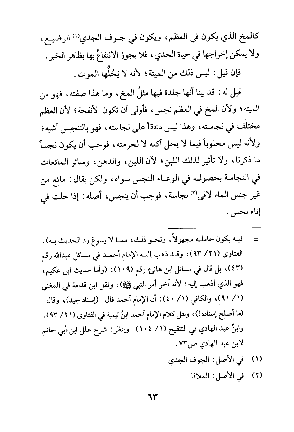 = فيه بكون حامله مجهولًا، ونحو ذلك، مما لا يسوغ رد الحديث به). الفتاوى (21/ 93)، وقد ذهب إليه الإمام أحمد في مسائل عبد الله رقم (43)، بل قال في مسائل ابن هانئ رقم (109): (وأما حديث ابن عكيم، فهو الذي أذهب إليه؛ لأنه آخر أمر النبي - صلى الله عليه وسلم -)، ونقل ابن قدامة في المغني (1/ 91)، والكافي (1/ 40): أن الإمام أحمد قال: (إسناد جيد)، وقال: (ما أصلح إسناده! )، ونقل كلام الإمام أحمد ابنُ تيمية في الفتاوى (21/ 93)، وابنُ عبد الهادي في التنقيح (1/ 104). وينظر: شرح علل ابن أبي حاتم لابن عبد الهادي ص 73.