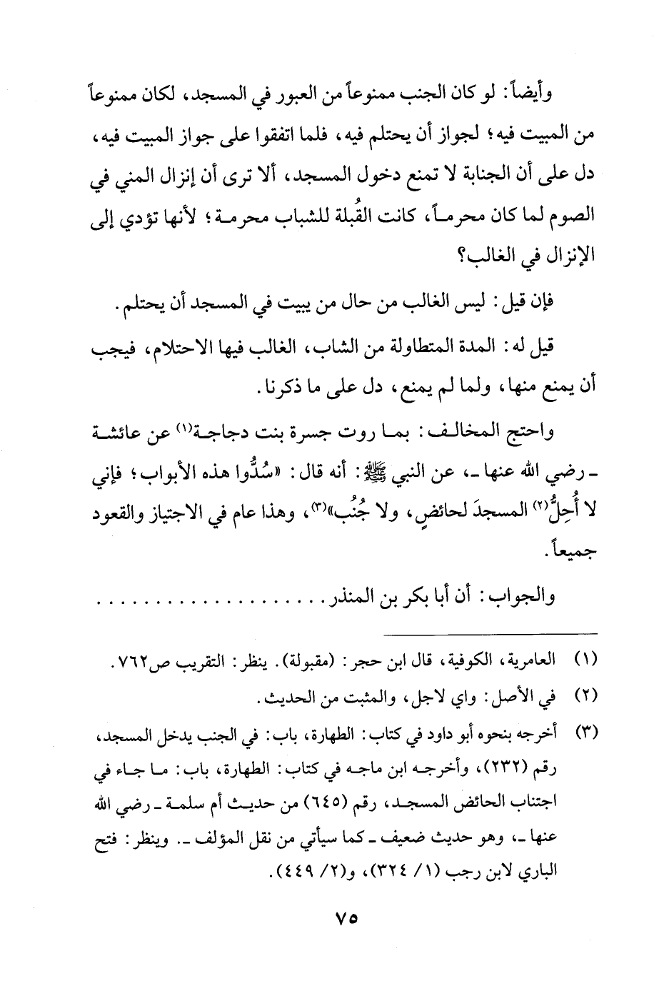وأيضًا: لو كان الجنب ممنوعًا من العبور في المسجد، لكان ممنوعًا من المبيت فيه؛ لجواز أن يحتلم فيه، فلما اتفقوا على جواز المبيت فيه، دل على أن الجنابة لا تمنع دخول المسجد، ألا ترى أن إنزال المني في الصوم لما كان محرمًا، كانت القُبلة للشباب محرمة؛ لأنها تؤدي إلى الإنزال في الغالب؟
