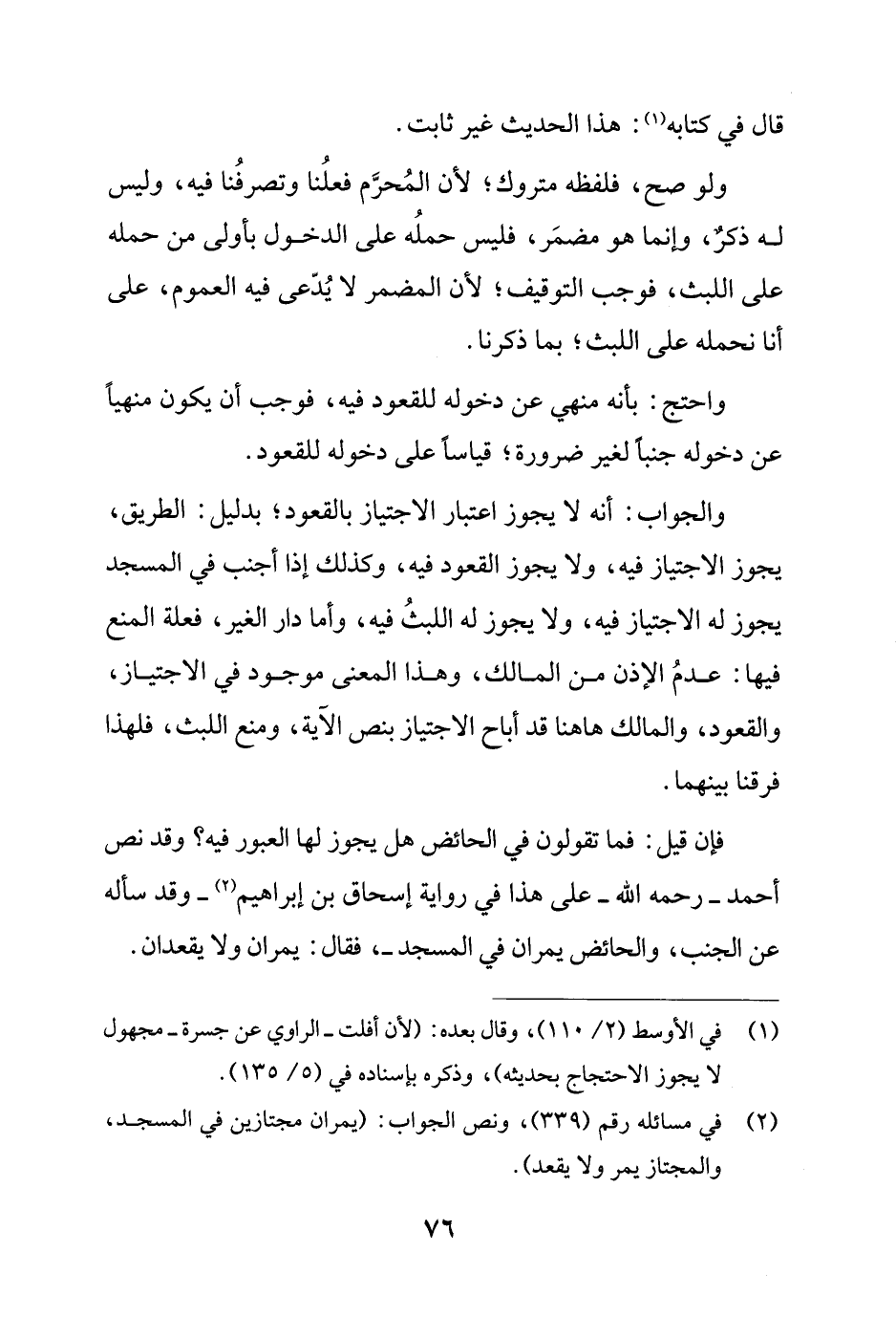 فإن قيل: فما تقولون في الحائض هل يجوز لها العبور فيه؟ وقد نص أحمد - رحمه الله - على هذا في رواية إسحاق بن إبراهيم (¬2) - وقد سأله عن الجنب، والحائض يمران في المسجد -، فقال: يمران ولا يقعدان.