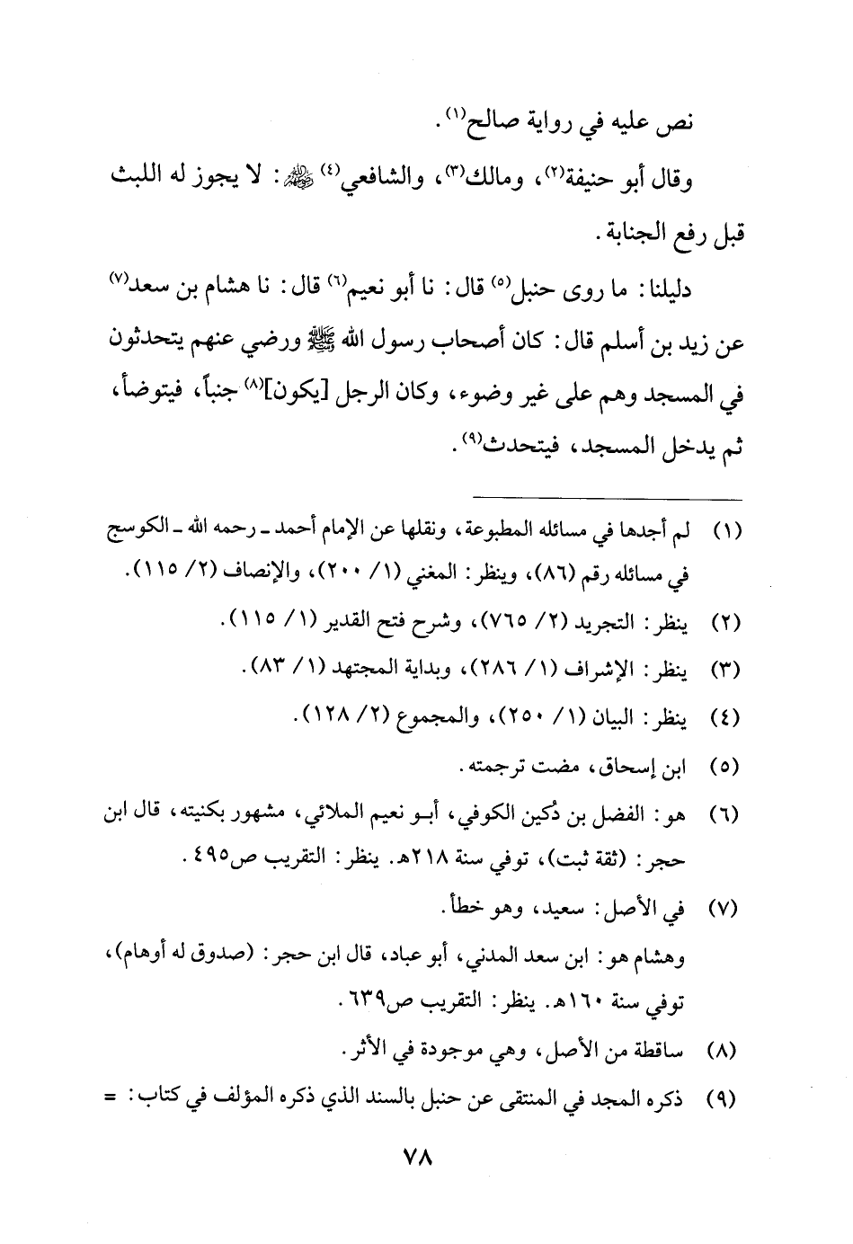 دليلنا: ما روى حنبل (¬5) قال: نا أبو نعيم (¬6) قال: نا هشام بن سعد (¬7) عن زيد بن أسلم قال: كان أصحاب رسول الله - صلى الله عليه وسلم - ورضي عنهم يتحدثون في المسجد وهم على غير وضوء، وكان الرجل [يكون] (¬8) جنبًا، فيتوضأ، ثم يدخل المسجد، فيتحدث (¬9).