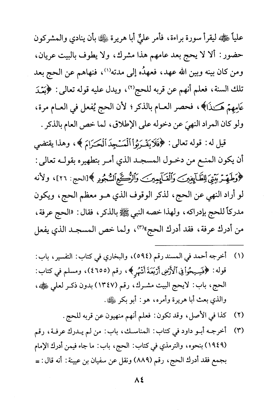 (¬1) أخرجه أحمد في المسند رقم (594)، والبخاري في كتاب: التفسير، باب: قوله؛ {فَسِيحُوا فِي الْأَرْضِ أَرْبَعَةَ أَشْهُرٍ}، رقم (4655)، ومسلم في كتاب: الحج، باب: لا يحج البيت مشرك، رقم (1347) بدون ذكر لعلي - رضي الله عنه -، والذي بعث أبا هريرة وأمره، هو: أبو بكر - رضي الله عنهما -.