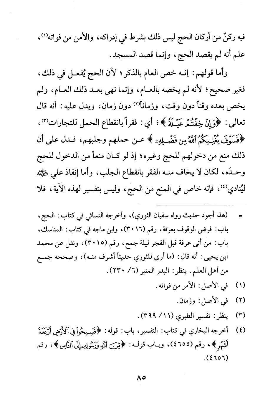 وأما قولهم: إنه خص العام بالذكر؛ لأن الحج يُفعل في ذلك، فغير صحيح؛ لأنه لم يخصه بالعام، وإنما نهى بعد ذلك العام، ولم يخص بعده وقتًا دون وقت، وزمانًا (¬2) دون زمان، ويدل عليه: أنه قال تعالى: {وَإِنْ خِفْتُمْ عَيْلَةً}؛ أي: فقرًا بانقطاع الحمل للتجارات (¬3)، {فَسَوْفَ يُغْنِيكُمُ اللَّهُ مِنْ فَضْلِهِ} عن حملهم وجلبهم، فدل على أن ذلك منع من دخولهم للحج وغيره؛ إذ لو كان منعًا من الدخول للحج وحدَه، لكان لا يخاف منه الفقر بانقطاع الجلب، وأما إنفاذ علي - رضي الله عنه - ليُنادي (¬4)، فإنه خاص في المنع من الحج، وليس بتفسير لهذه الآية، فلا