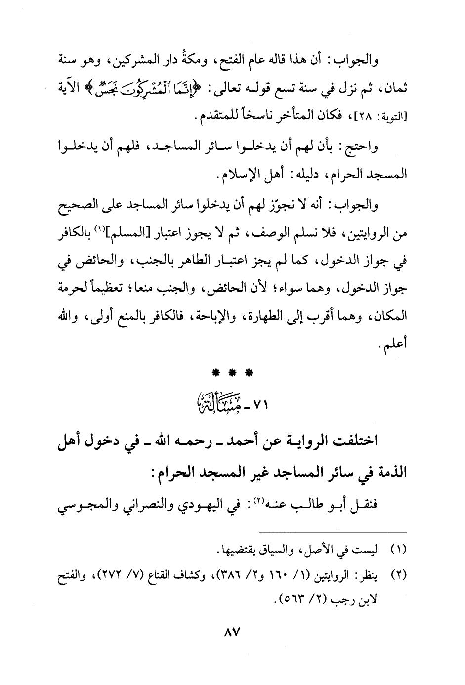 71 - مَسْألَة: اختلفت الرواية عن أحمد - رحمه الله - في دخول أهل الذمة في سائر المساجد غير المسجد الحرام: