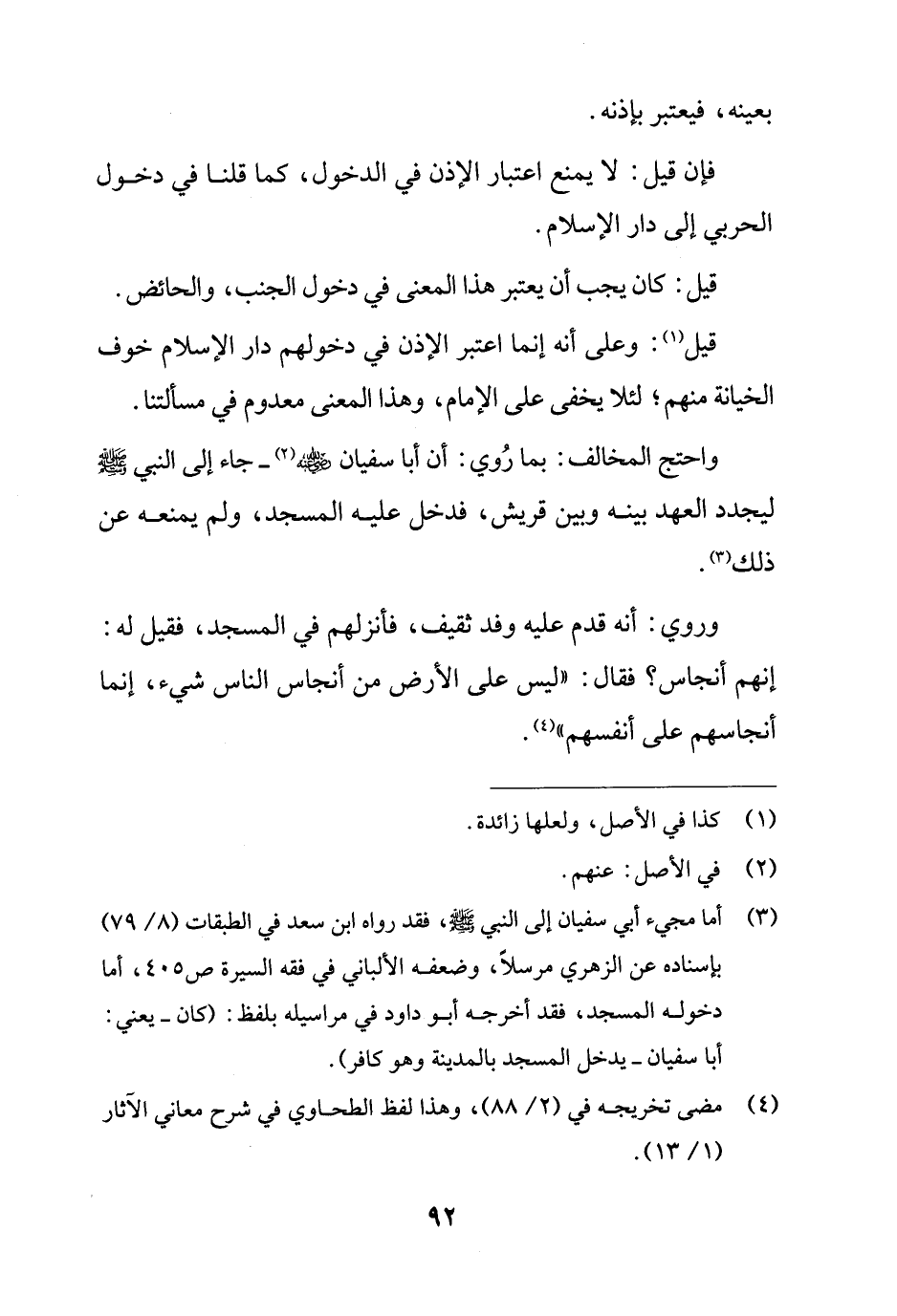 (¬3) أما مجيء أبي سفيان إلى النبي - صلى الله عليه وسلم -، فقد رواه ابن سعد في الطبقات (8/ 79) بإسناده عن الزهري مرسلًا، وضعفه الألباني في فقه السيرة ص 405، أما دخوله المسجد، فقد أخرجه أبو داود في مراسيله بلفظ: (كان - يعني: أبا سفيان - يدخل المسجد بالمدينة وهو كافر).
