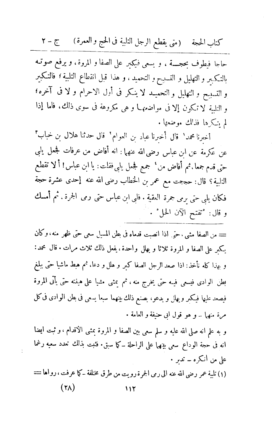 أخبرنَا مُحَمَّد قَالَ أخبرنَا عباد بن الْعَوام قَالَ حَدثنَا هِلَال بن خباب عَن عِكْرِمَة عَن ابْن عَبَّاس رَضِي الله عَنْهُمَا أَنه أَفَاضَ من عَرَفَات فَجعل يُلَبِّي حَتَّى قدم جمعا ثمَّ أَفَاضَ من جمع فَجعل يُلَبِّي فَقلت يَا ابْن عَبَّاس أَلا تقطع التَّلْبِيَة قَالَ حججْت مَعَ عمر بن الْخطاب رَضِي الله عَنهُ إِحْدَى عشرَة حجَّة فَكَانَ يُلَبِّي حَتَّى يَرْمِي جَمْرَة الْعقبَة فلبى ابْن عَبَّاس حَتَّى رمى الْجَمْرَة ثمَّ أمسك وَقَالَ تفتح الْآن الْحل