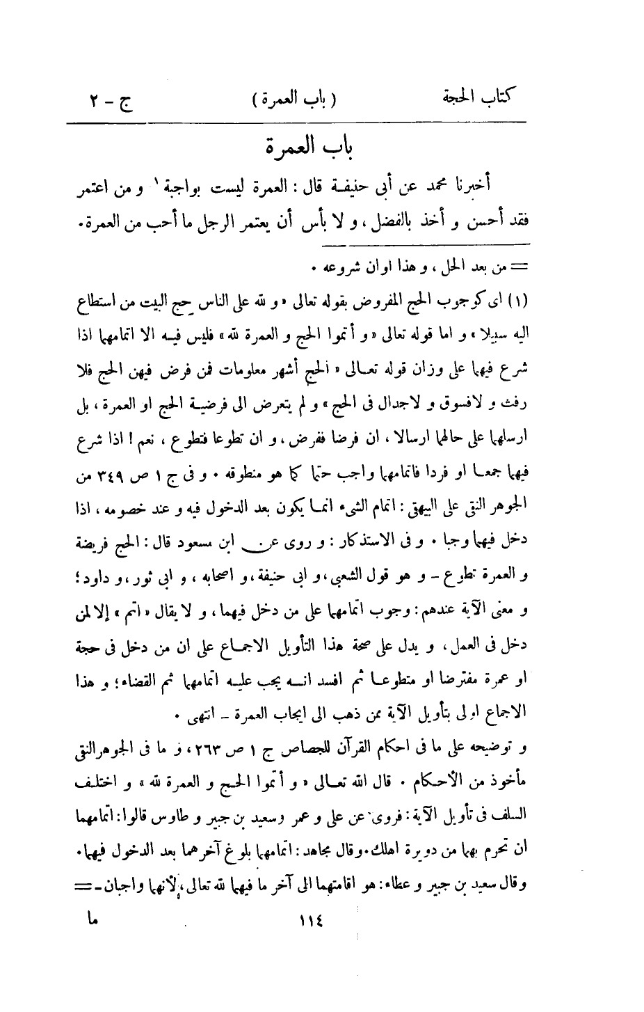 اُخْبُرْنَا مُحَمَّد عَن أبي حنيفَة قَالَ الْعمرَة لَيست بواجبة وَمن اعْتَمر فقد احسن واخذ بِالْفَضْلِ وَلَا بَأْس ان يعْتَمر الرجل مَا احب من الْعمرَة