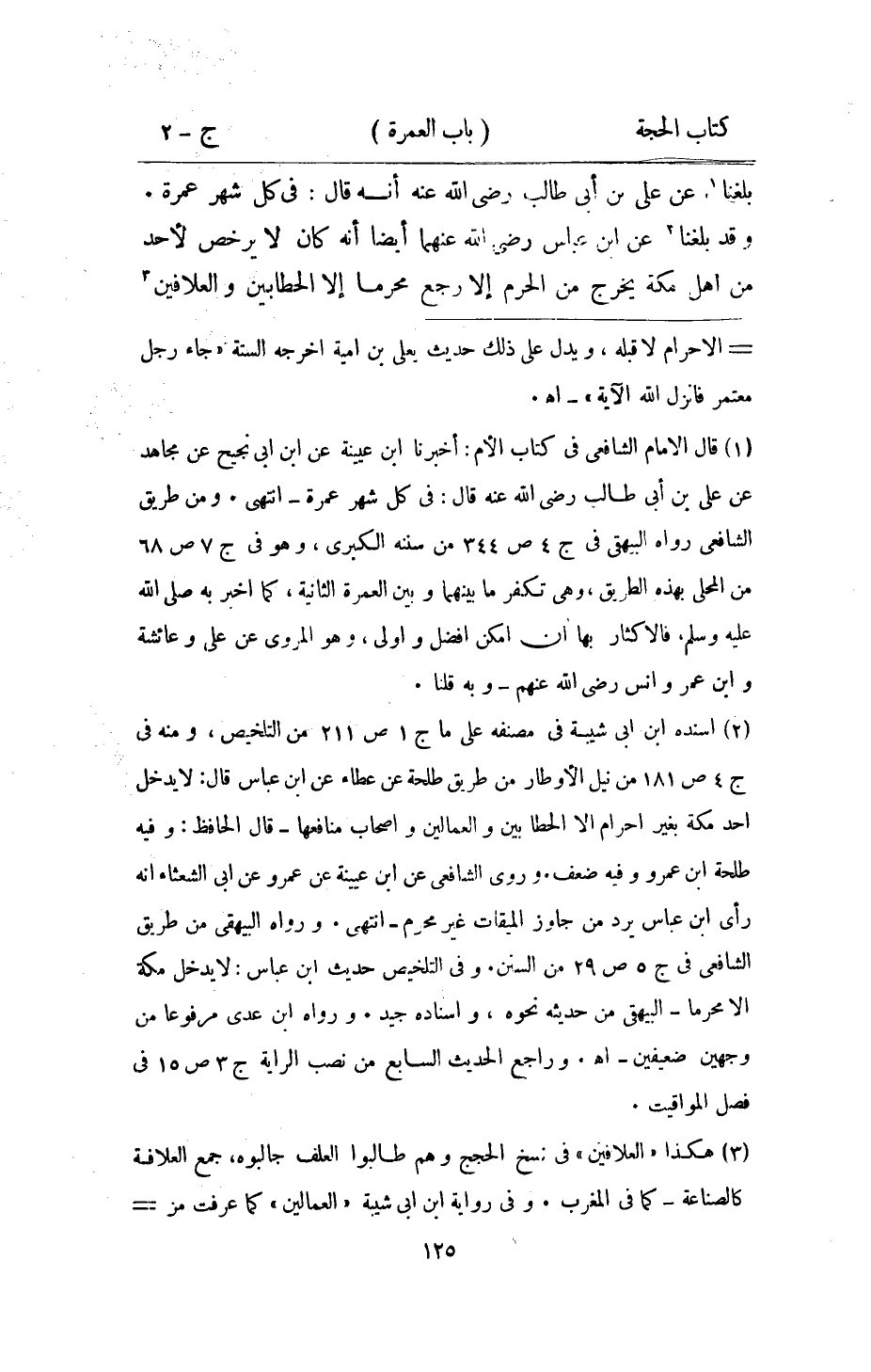 بلغنَا عَن عَليّ بن أبي طَالب رَضِي الله عَنهُ أَنه قَالَ فِي كل شهر عمْرَة وَقد بلغنَا عَن ابْن عَبَّاس رَضِي الله عَنْهُمَا أَيْضا أَنه كَانَ لَا يرخص لأحد من أهل مَكَّة يخرج من الْحرم إِلَّا رَجَعَ محرما إِلَّا الحطابين والعلافين