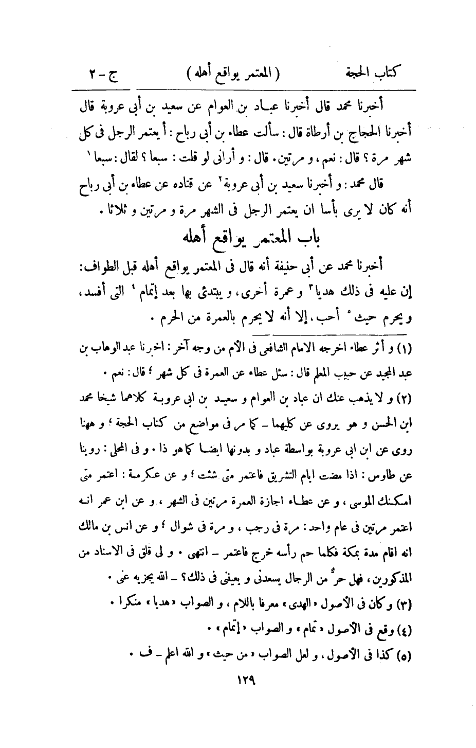 قَالَ مُحَمَّد واخبرنا سعيد بن أبي عرُوبَة عَن قَتَادَة عَن عَطاء بن أبي رَبَاح انه كَانَ لَا يرى بَأْسا ان يعْتَمر الرجل فِي الشَّهْر مرّة ومرتين وَثَلَاثًا