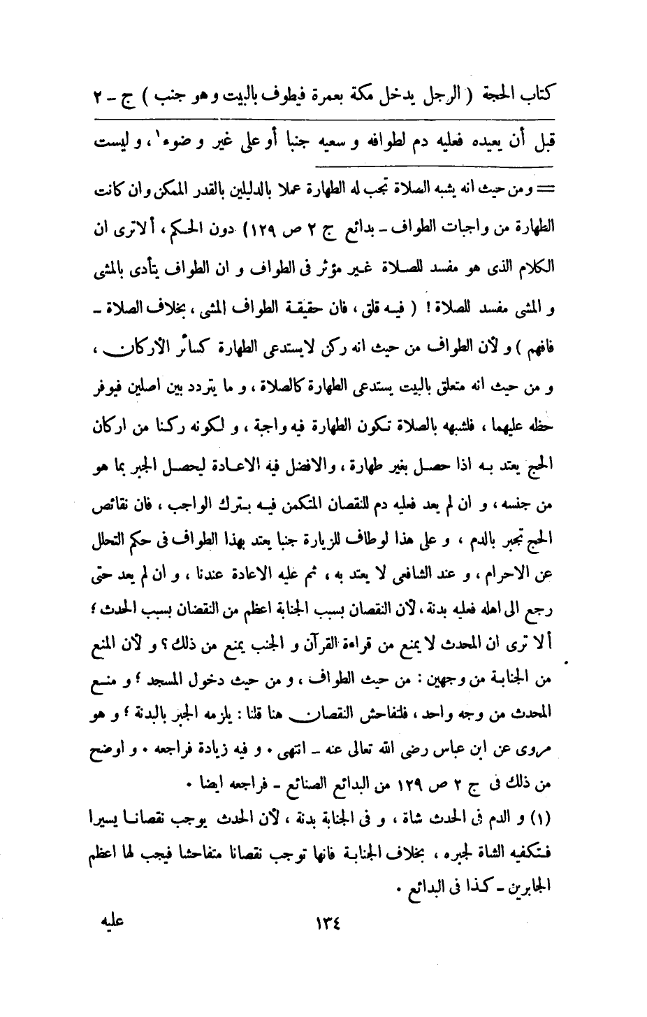 قبل أَن يُعِيدهُ فَعَلَيهِ دم لطوافه وسعيه جنبا أَو على غير وضوء وَلَيْسَت