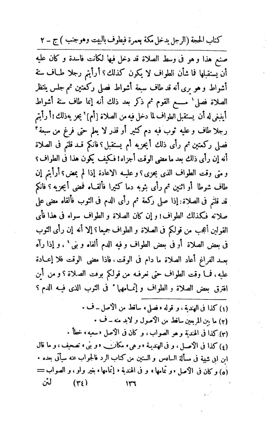 صنع هَذَا وَهُوَ فِي وسط الصَّلَاة قد دخل فِيهَا لكَانَتْ فَاسِدَة وَكَانَ عَلَيْهِ ان يستقبلها فَمَا شَأْن الطّواف لَا يكون كَذَلِك أَرَأَيْتُم رجلا طَاف سِتَّة اشواط وَهُوَ يرى انه قد طَاف سَبْعَة اشواط فصلى رَكْعَتَيْنِ ثمَّ جلس ينْتَظر الصَّلَاة فصلى مَعَ الْقَوْم ثمَّ ذكر بعد ذَلِك انه إِنَّمَا طَاف سِتَّة اشواط اينبغي لَهُ أَن يسْتَقْبل الطّواف لما دخل فِيهِ من الصَّلَاة ام يجْزِيه ذَلِك ارايتم رجلا طَاف وَعَلِيهِ ثوب فِيهِ دم كثيرا أَو قذر لَا يعلم حَتَّى فرغ من سَبْعَة فصلى رَكْعَتَيْنِ ثمَّ رأى ذَلِك ايجزيه ام يسْتَقْبل فانكم قد قُلْتُمْ فِي الصَّلَاة انه ان رأى ذَلِك بعد مَا مضى الْوَقْت اجزاه فَكيف يكون هَذَا فِي الطّواف وَمَتى وَقت الطّواف الَّذِي يجزى وَعَلِيهِ الْإِعَادَة إِذا لم يمض أَرَأَيْتُم إِن طَاف شوطا أَو اثْنَيْنِ ثمَّ رأى بِثَوْبِهِ دَمًا كثيرا فَأَلْقَاهُ فَمضى ايجزيه فَإِنَّكُم قد قُلْتُمْ فِي الصَّلَاة إِذا صلى رَكْعَة ثمَّ رأى الدَّم فِي الثَّوْب فَأَلْقَاهُ مضى على صلَاته فَكَذَلِك الطّواف وان كَانَ الصَّلَاة وَالطّواف سَوَاء فِي هَذَا فَأَي الْقَوْلَيْنِ أعجب من قَوْلكُم فِي الصَّلَاة وَالطّواف جَمِيعًا إِلَّا أَنه إِن رأى الثَّوْب فِي بعض الصَّلَاة أَو فِي بعض الطّواف وَفِيه الدَّم أَلْقَاهُ وَبني وَإِذا رَآهُ بعد الْفَرَاغ أعَاد الصَّلَاة مَا دَامَ فِي الْوَقْت فَإِذا مضى الْوَقْت فَلَا إِعَادَة عَلَيْهِ فَمَا وَقت الطّواف حَتَّى نعرفه من قَوْلكُم بِوَقْت الصَّلَاة وَمن أَيْن افترق بعض الصَّلَاة وَالطّواف واتمامهما فِي الثَّوْب الَّذِي فِيهِ الدَّم