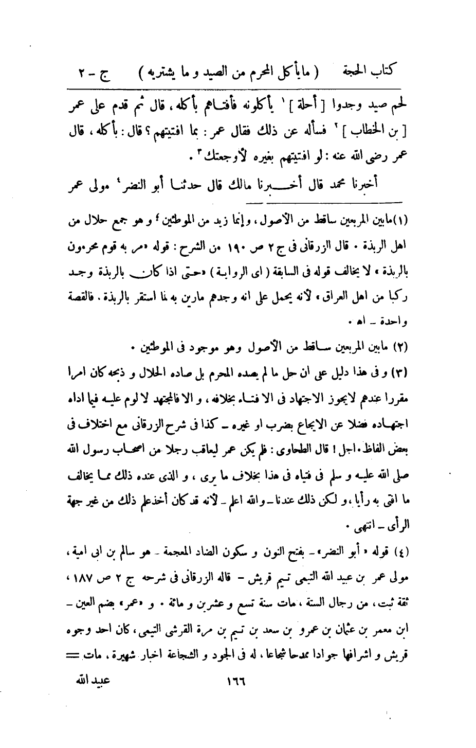 لحم صيد وجدوا احله يَأْكُلُونَهُ فأفتاهم بِأَكْلِهِ قَالَ ثمَّ قدم على عمر بن الْخطاب فَسَأَلَهُ عَن ذَلِك فَقَالَ عمر بِمَا أفتيتهم قَالَ بِأَكْلِهِ قَالَ عمر رَضِي الله عَنهُ لَو افتيتهم بِغَيْرِهِ لاوجعتك