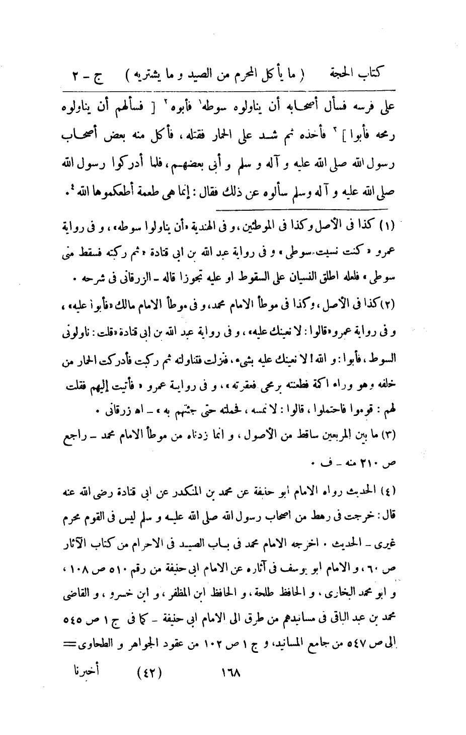 على فرسه فَسَأَلَ أَصْحَابه أَن يناولوه سَوْطه فأبوه فَسَأَلَهُمْ ان يناولوه رمحة فَأَبَوا فَأَخذه ثمَّ شدّ على الْحمار فَقتله فَأكل مِنْهُ بعض اصحاب رَسُول الله صلى الله عَلَيْهِ وَسلم وأبى بَعضهم فَلَمَّا أدركوا رَسُول الله صلى الله عَلَيْهِ وَسلم سَأَلُوهُ عَن ذَلِك فَقَالَ إِنَّمَا هِيَ طعمة اطعكموها الله